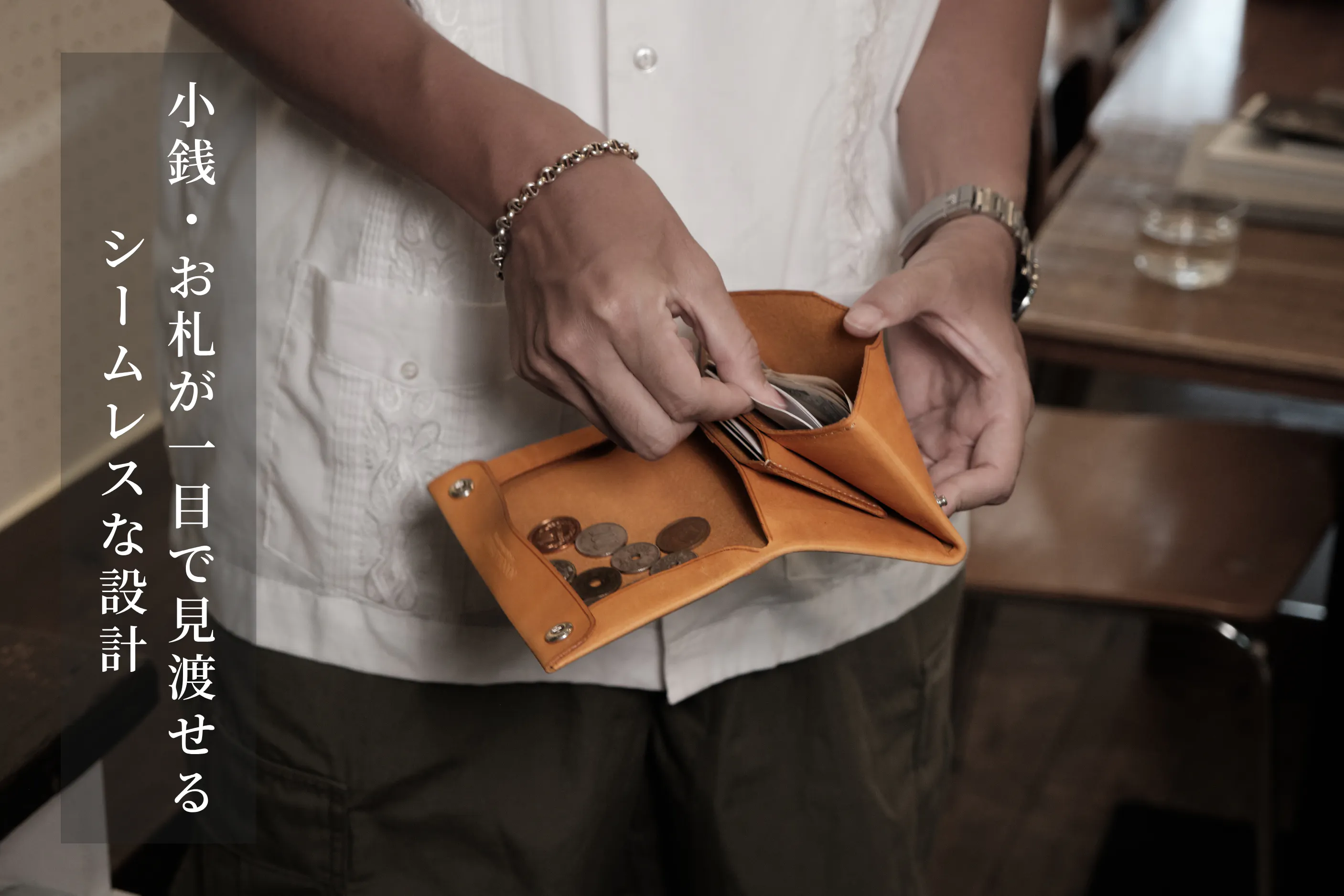 境界のない構造によって、財布の中身をひと目で見渡せる開放感を実現しました。