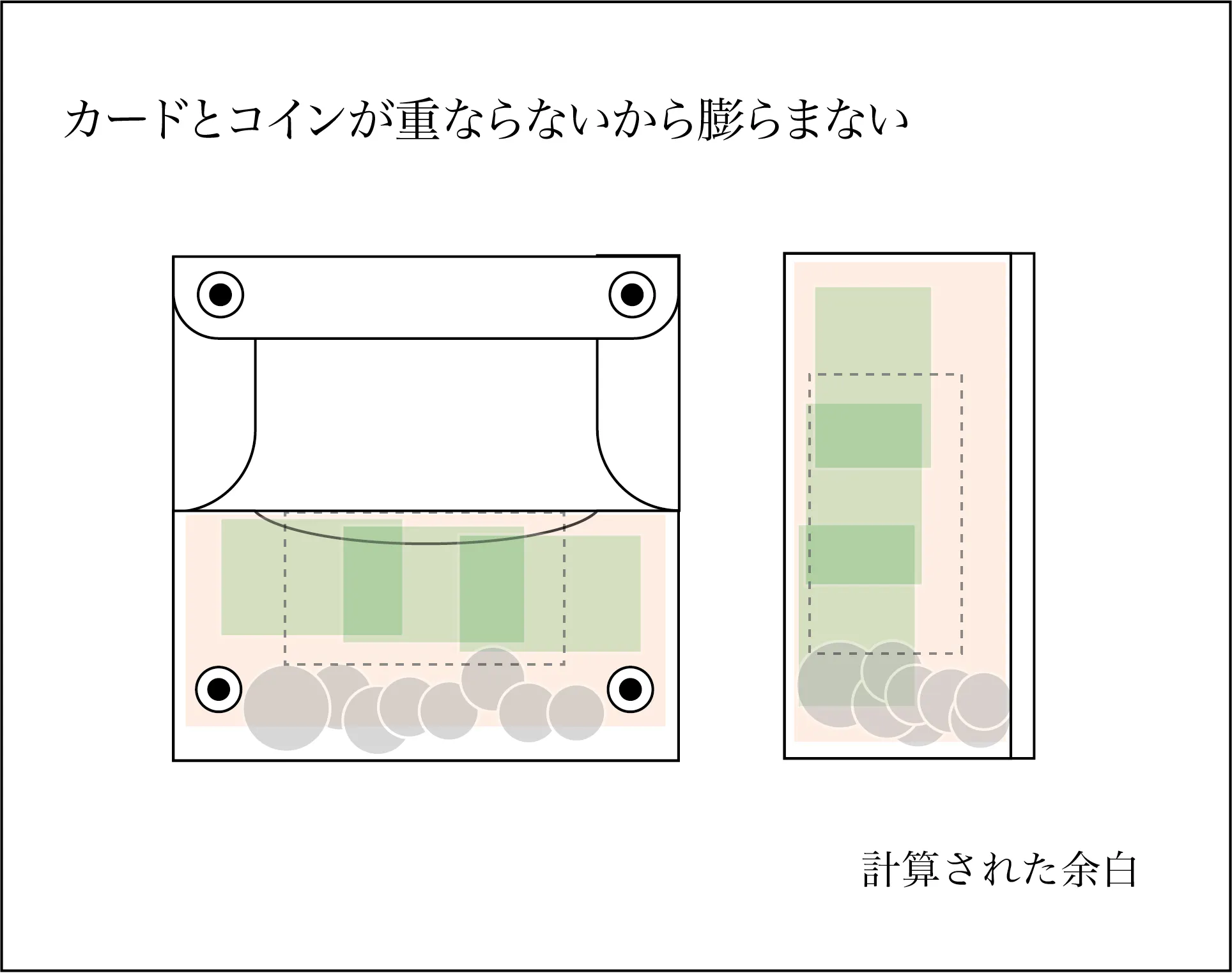 財布の下側と両サイドの余白は、ポケットに入れた際のコインの移動を促し、かさばりを軽減します。