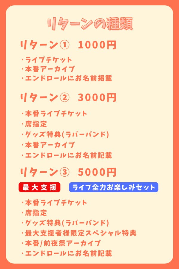 内容は、ライブにご来場される方・来られない方、どちらにも共通のリターン内容となっています。