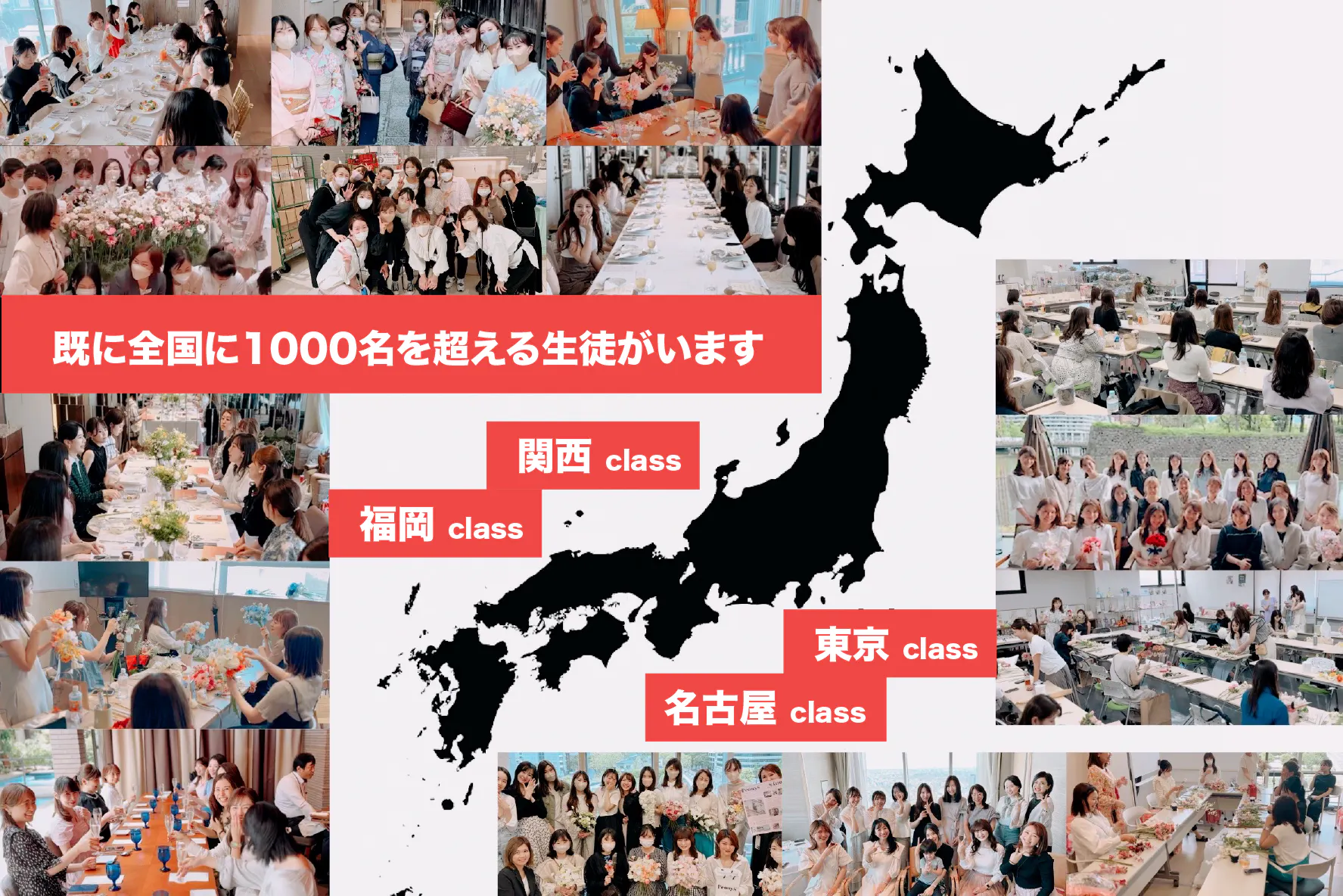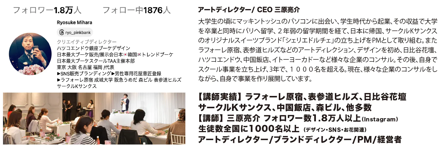私のスクールには現在、対面で、東京、横浜、名古屋、京都、大阪、福岡。オンラインの生徒を含め、1000名を超える生徒が全国にいます。副業のための、SNSや、お花、講義、ブランディング、販売の仕方を学び、常に最新の学びの共有を大切にしています。