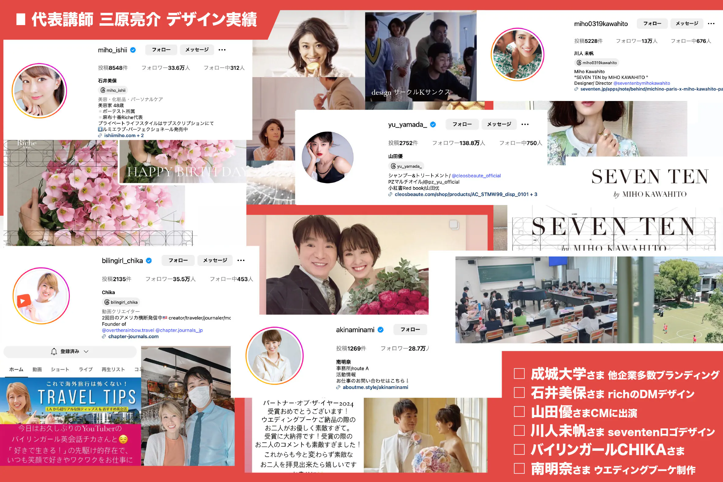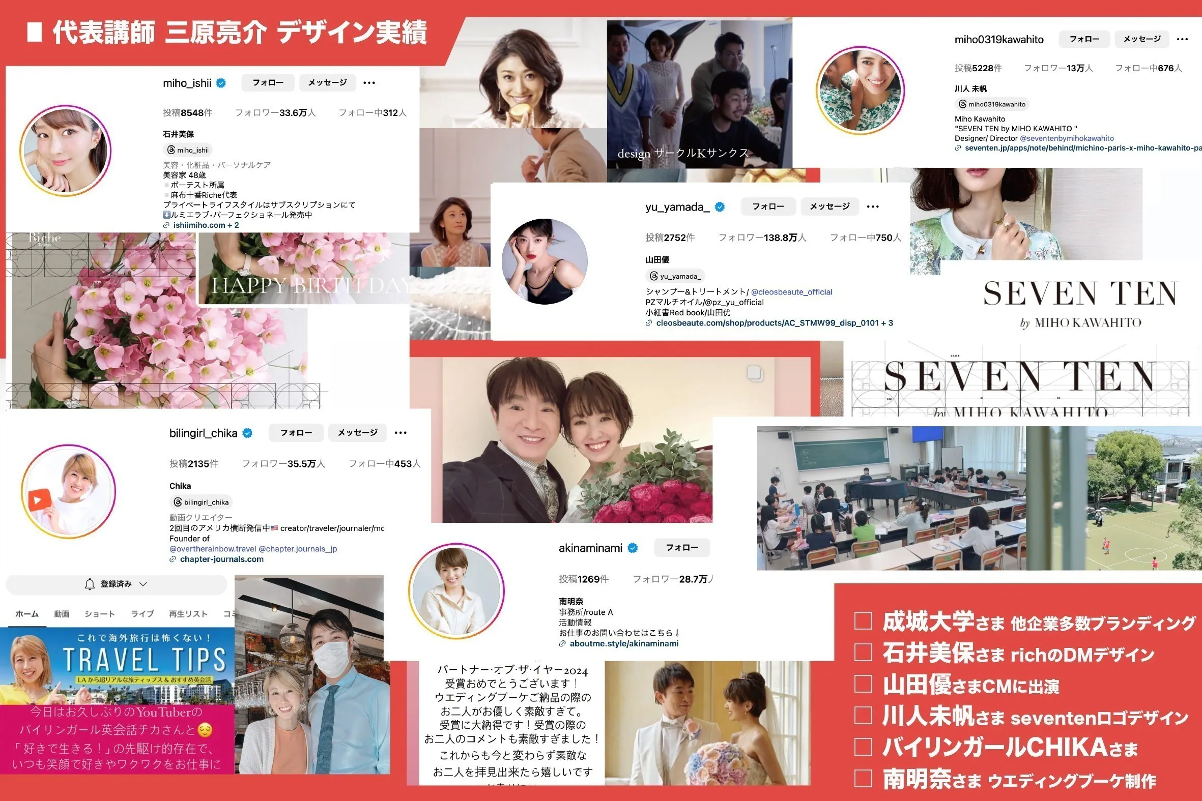 ※私の得意なジャンルは女性らしい、美しく繊細なデザイン、アートディレクション。またお花をインスピレーションとしたデザインです。上記は、わたくし三原の個人クライアントの皆さで、制作実績を掲載しております。多くの才能ある女性の皆さまとお仕事をご一緒させていただいております。ありがとうございます。