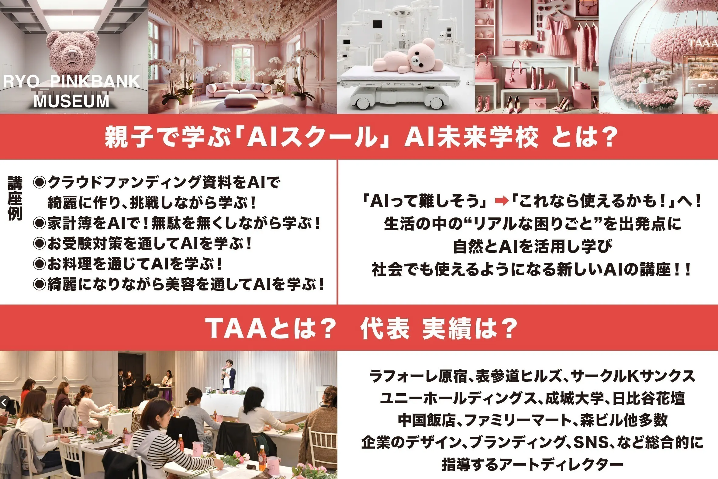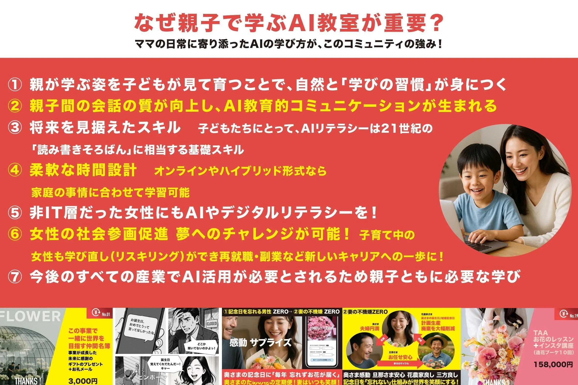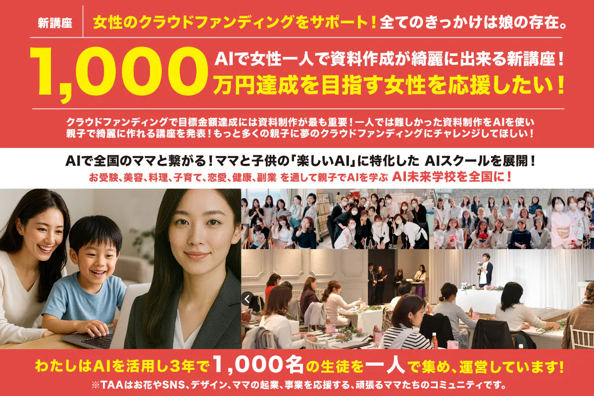 SNSと同様、周りに遅れをとらないこと。早くスタートすること。が重要で、先月まで、まだまだ不安定だったAIも、今月あたりから段々と、正確に、より優秀に、本当の人間のように完成度が上がってきました。今から、みんな一緒のスタートラインだということで、この度、他に先駆けて、女性向け、親子向けの、親しみやすいAI教室を全国に展開します!