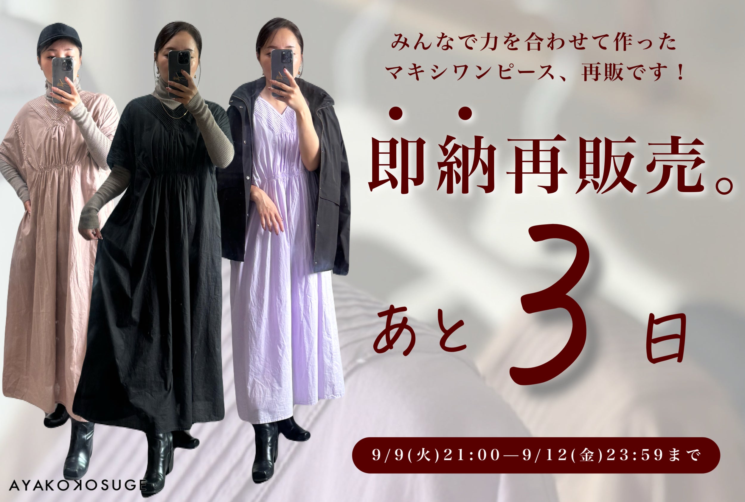 マキシワンピ即納再販まであと3日!!9月9日(火)21:00 こちらから!!9/9(火)21:00の再販開始後、9/10(水)からすぐに発送を始めます!! 秋冬もぜひ着ていただけたら嬉しい。皆さんに作っていただいたワンピース、再販も頑張ります!!!※ご注文ページできました!!(でも画像が全然まだ!!今日は今から画像差し込みます!!!) こすげあやこ