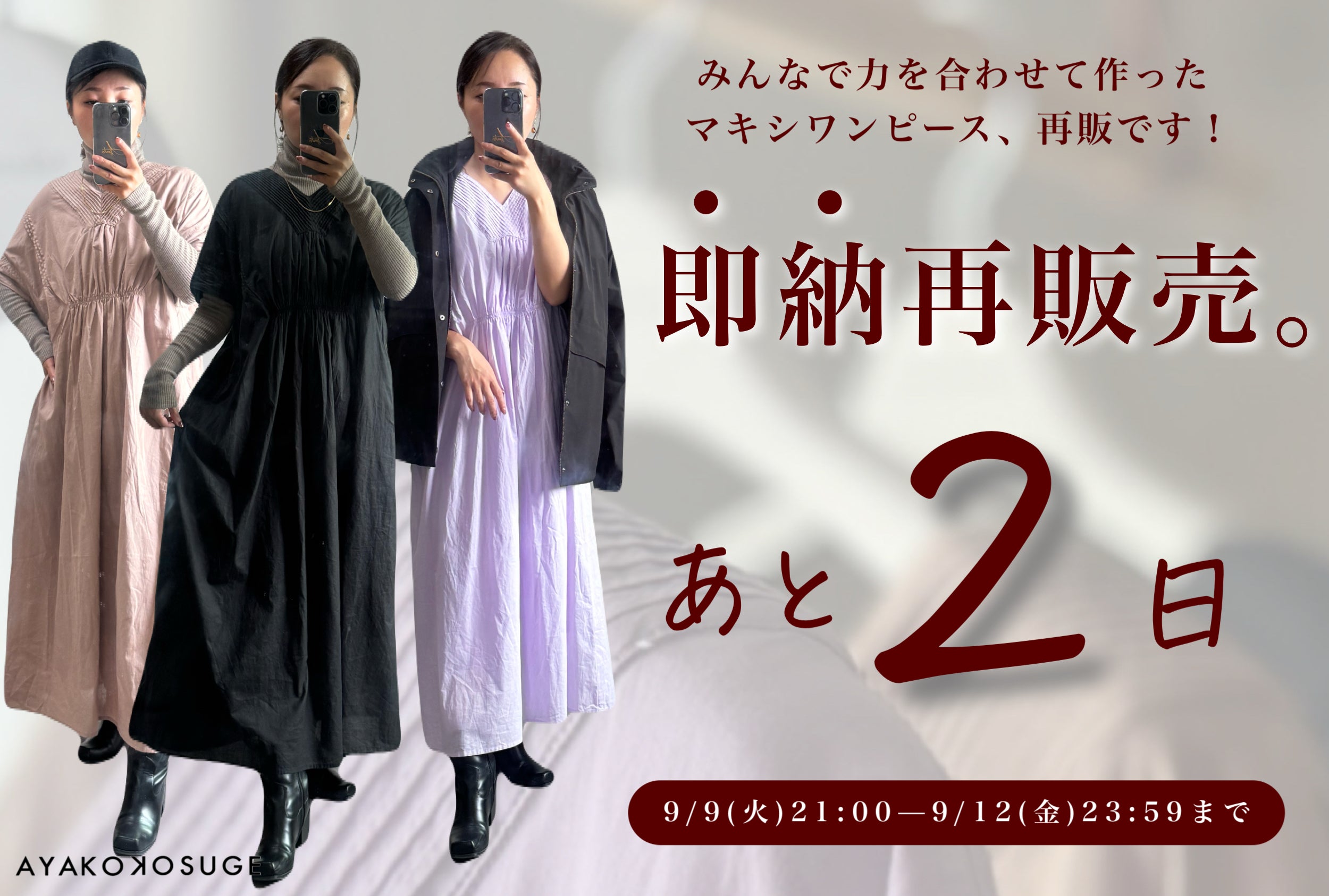 今夜Instagramで、マキシワンピース再販のことで大事なお知らせがあります!!どうか、ぜひご覧ください!!こすげあやこ