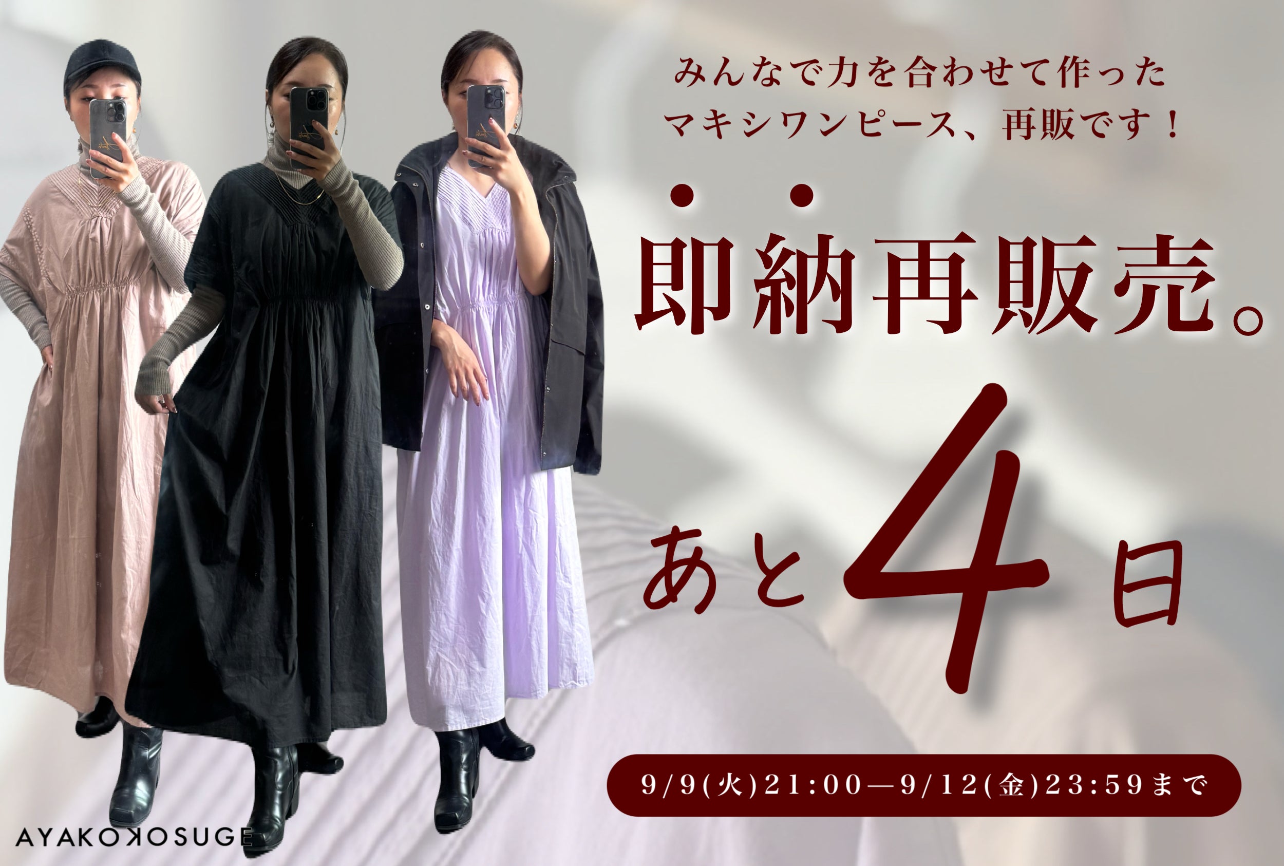 【ワンピース再販のお知らせ】お待たせいたしました!!クラファンマキシワンピース再販のお知らせです!!即納で発送します!!クラファンでワンピースをご注文いただいて、お色違いなどご検討されていた方はぜひ今回の再販売でお買い求めください!!9月9日(火)21時ここからご注文できます!!この夏は、本当に本当に、AYAKO KOSUGEの3つの丈を用意したマキシワンピースを作りたい!というクラウドファンディングに4,170,700円という多大なるご支援を本当にありがとうございました!皆様、しっかりお手元には届いておりますでしょうか?万が一届いていないというかたはInstagram @kosuge.ayako までご連絡をお願いいたします!今回、皆様のおかげで当初予定していた500着を超えて600着の生産を叶えることが出来ました。 こちら、ちょうど1週間後の9月9日(火)21:00即納再販売いたします!!即納、つまり9月9日(火)21:00以降にご注文いただけたら、9月10日(水)からすぐに発送いたします!目標は3日以内発送完了です!今回もこすげのお父さんのまかない食べながら一緒に発送頑張ります!! いつも週末に販売することの多いAKですがなぜ今回火曜日なのか?それは・・・1日でも早くお届けしたいからです!! このワンピース、夏のワンピースに見えますが、じつは秋冬も着られるオールシーズンワンピースなんです! 今日からストーリーズを使って秋冬の着こなしを1週間かけてたっくさんお見せしていきたいと思います!!ぜひチェックしてみてください!「物より物語。」ドラマ感じるブランドを皆さんと一緒に作っていきたいと思います。ちなみに、たくさん在庫を作ったワンピースですが、ライラックのMのみ、これだけがあと3枚しかないです 今のとこライラックMのみ追加生産するという予定はないので気になられている方ぜひ!こちらはお早めにアクセスされることを超おすすめいたします!それでは!9月9日(火)21:00オンラインショップでお待ちしております!!!今回もどうぞよろしくお願いいたします!!!それではまた、手紙を書きます。P.Sワンピースのご注文ページこれから作ります!!!さーやるぞーーーーー!!!!!AYAKO KOSUGE 代表小菅彩子