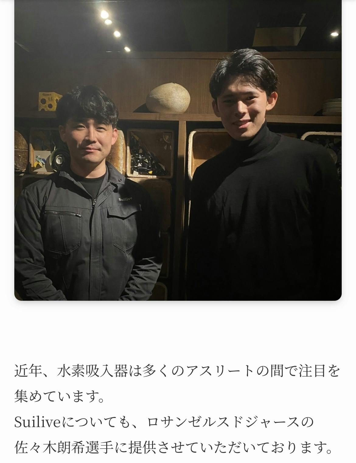 導入する水素吸入器のSuilive-300+は、サッカーのパリサンジェルマンにも導入されていることや、サッカー日本代表の選手、ドジャースの佐々木朗希選手、他様々なアスリート、Mattさんらが身体のケアに使用されています。