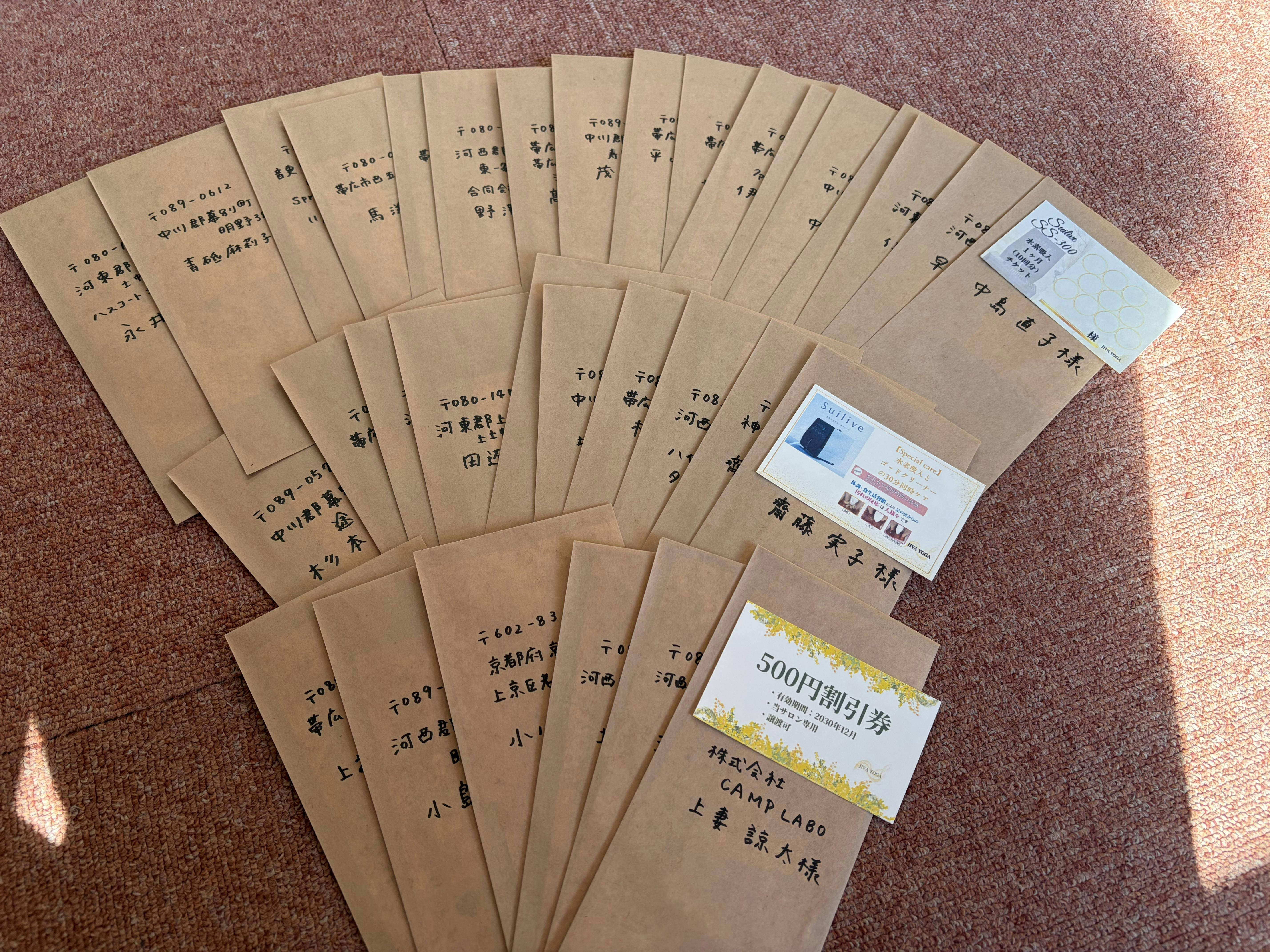 そして、お待たせしております、1回体験とスペシャルケアなどのチケットのリターン品も本日発送させていただきました。