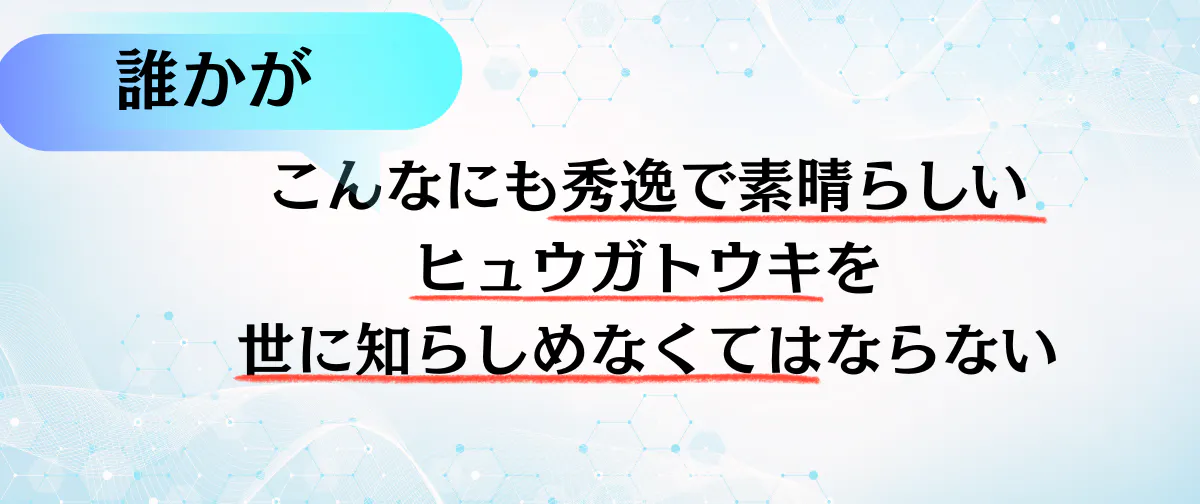 ヒュウガトウキを飲んだお客様が口々に感謝し、喜び、飛ぶように売れるのを目の当たりにしていたプロジェクトオーナーは、ブレイク寸前で姿を消し、再び知る人ぞ知る脅威の健康食材としてアンダーグラウンドな存在になるにはあまりにも勿体無いと感じました。このままではいけない。ヒュガトウキは多くの人を元気にし、健康にし、幸せにできるものなのだから、何としてでも多くの人に知らしめなくてはいけない。