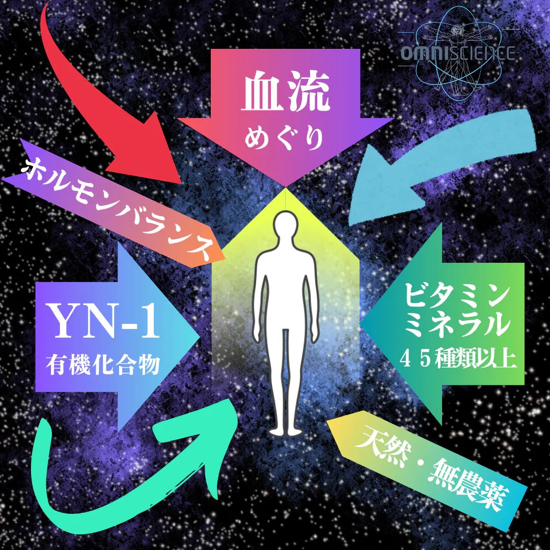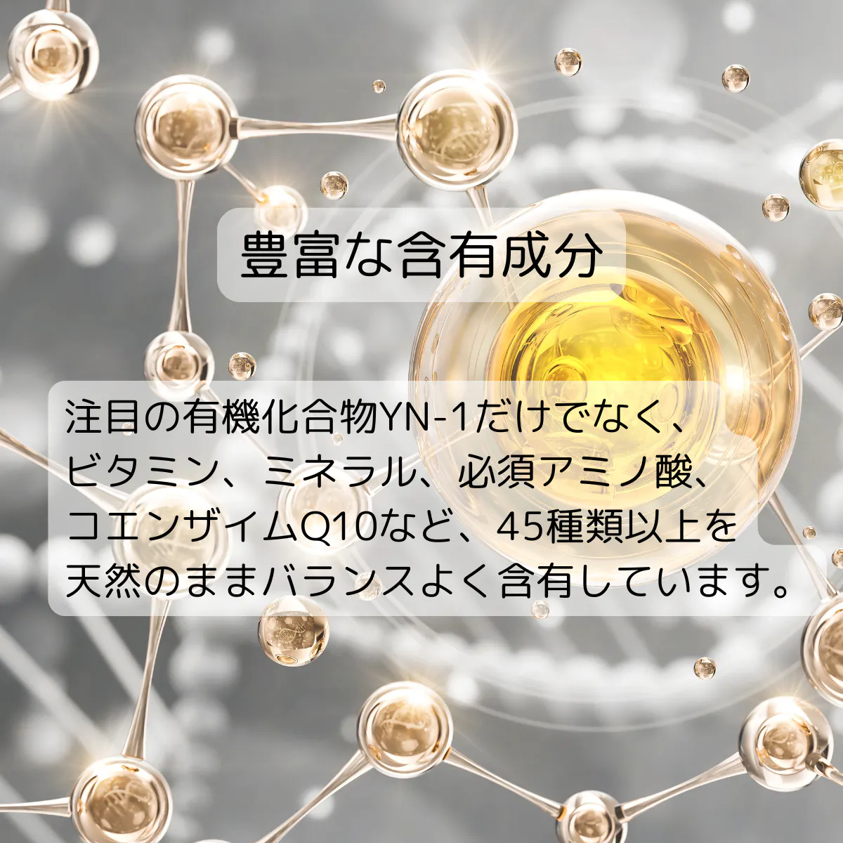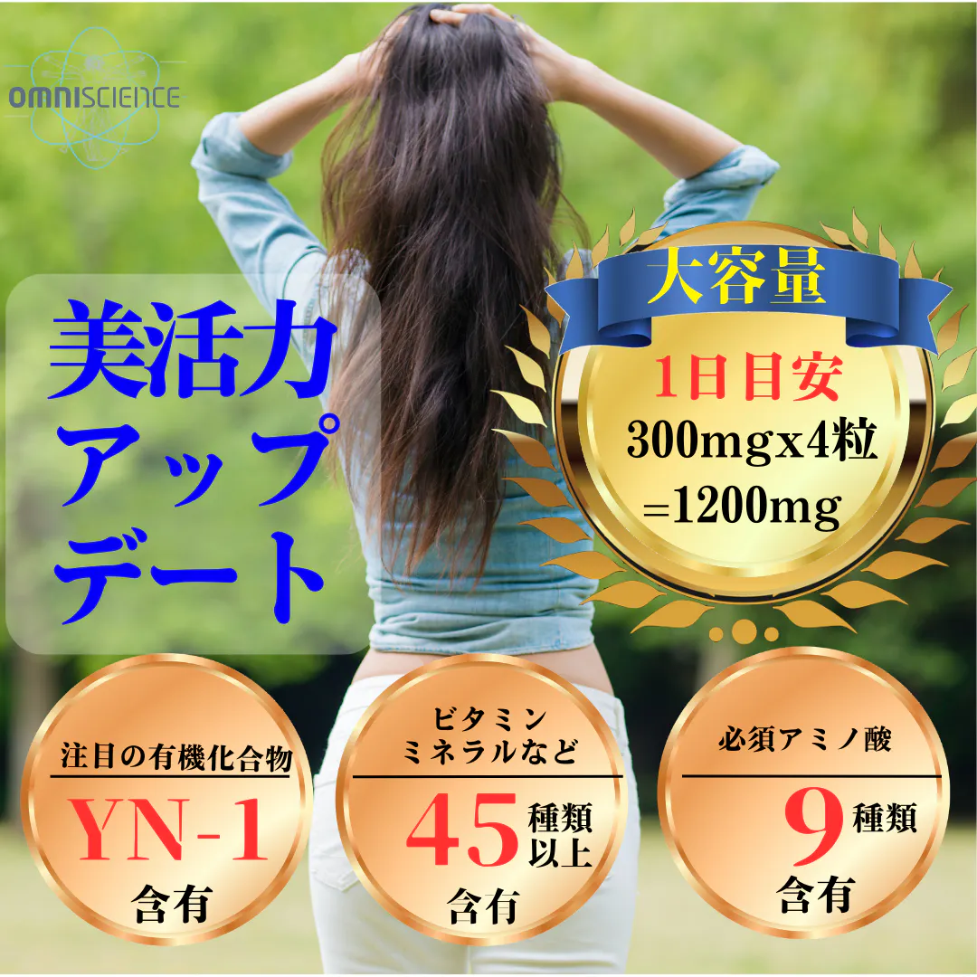 注目のYN-1をはじめとして必須アミノ酸9種類をすべて含み、コエンザイムQ10、ビタミンミネラルなどを45種類以上バランスよく含んでいます。