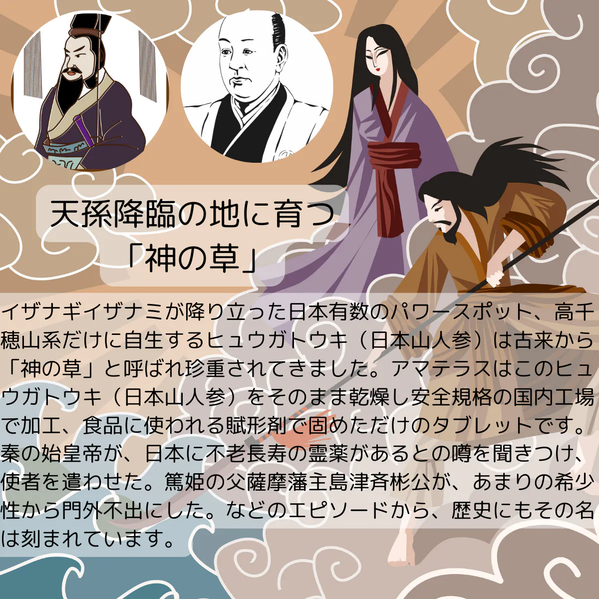 「不老長寿の霊薬」の噂を耳にした秦の始皇帝が徐福という薬師を使者として遣わせました。徐福が1000人のお供を連れ船で海を渡り、宮崎県の延岡に船を繋留したとされる徐福岩が残っています。