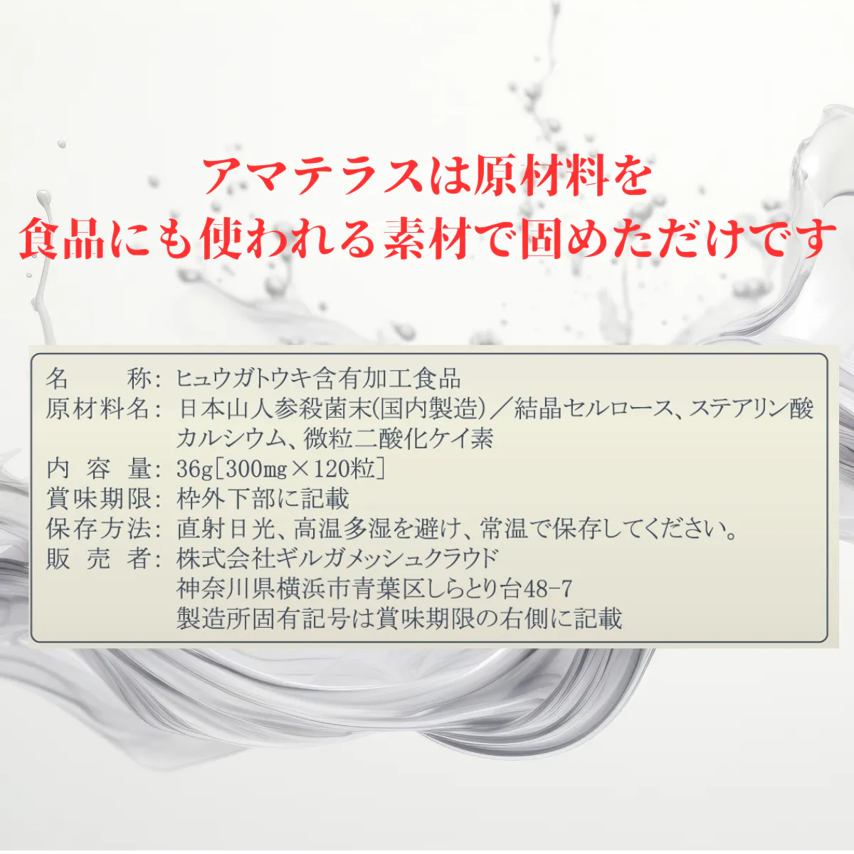 アマテラスは乾燥したヒュウガトウキの葉と茎を、食品にも使われる賦形剤で固めただけの、安心安全なサプリメントです。