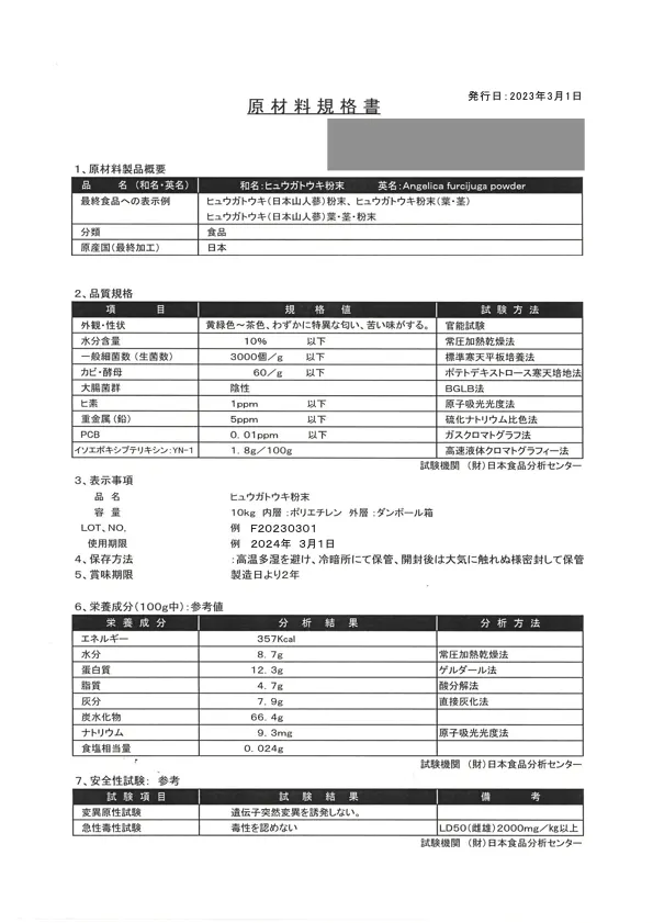 【原材料】ヒュウガトウキ殺菌末(葉・茎)、結晶セルロース、ステアリン酸カルシウム、微粒二酸化ケイ素
