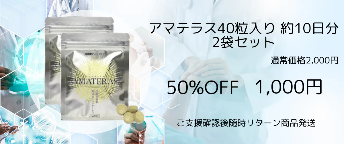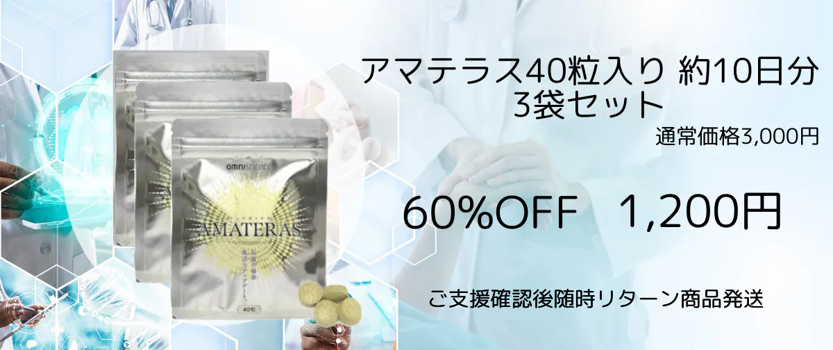 希少なヒュウガトウキは高級健康食材として、約1ヶ月分12,000円で販売されていました。今回全く同じ原料を使用し、全く同じ製法で、安全規格のGMP工場で生産したヒュウガトウキサプリメント「アマテラス」を約1ヶ月分2,980円で販売します。素晴らしい力を持つヒュウガトウキをより多くの皆様にお届けしたいからです。