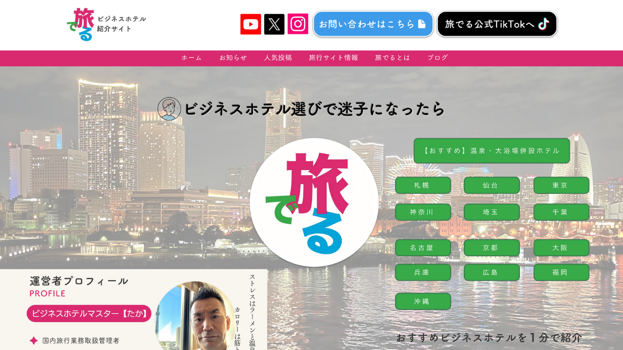 「旅でる」は、ベッド・大浴場・朝食の3点のクオリティが高いビジネスホテルを、宿泊需要の多い札幌から那覇まで全国13都市約500軒を選定し、自ら宿泊・撮影した視聴者目線のリアルな情報を1分動画でお届けするSNSメディアです。皆様のビジネスホテルリサーチの手間と時間を省き、宿泊失敗を無くします。