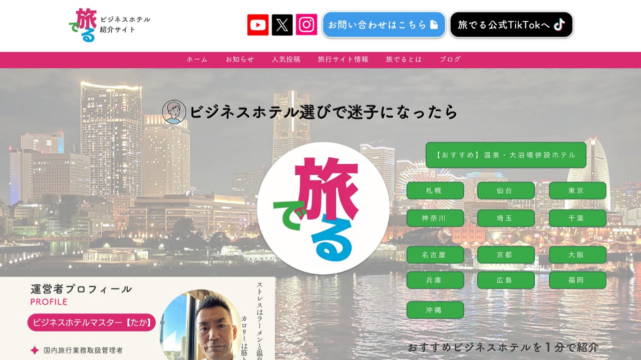 「旅でる」は、私1人で作るサイトでなく視聴者の皆様からの宿泊感想やご意見を取り入れ、信用度の高いお得な宿泊情報を発信していきます。限られたエリアではお届けできる情報も限定的なため、年内に主要13都市で1都市5軒、全国100軒以上のビジネスホテル紹介を行います。その後は47都道府県のおすすめビジネスホテルをご案内して全国を網羅します。