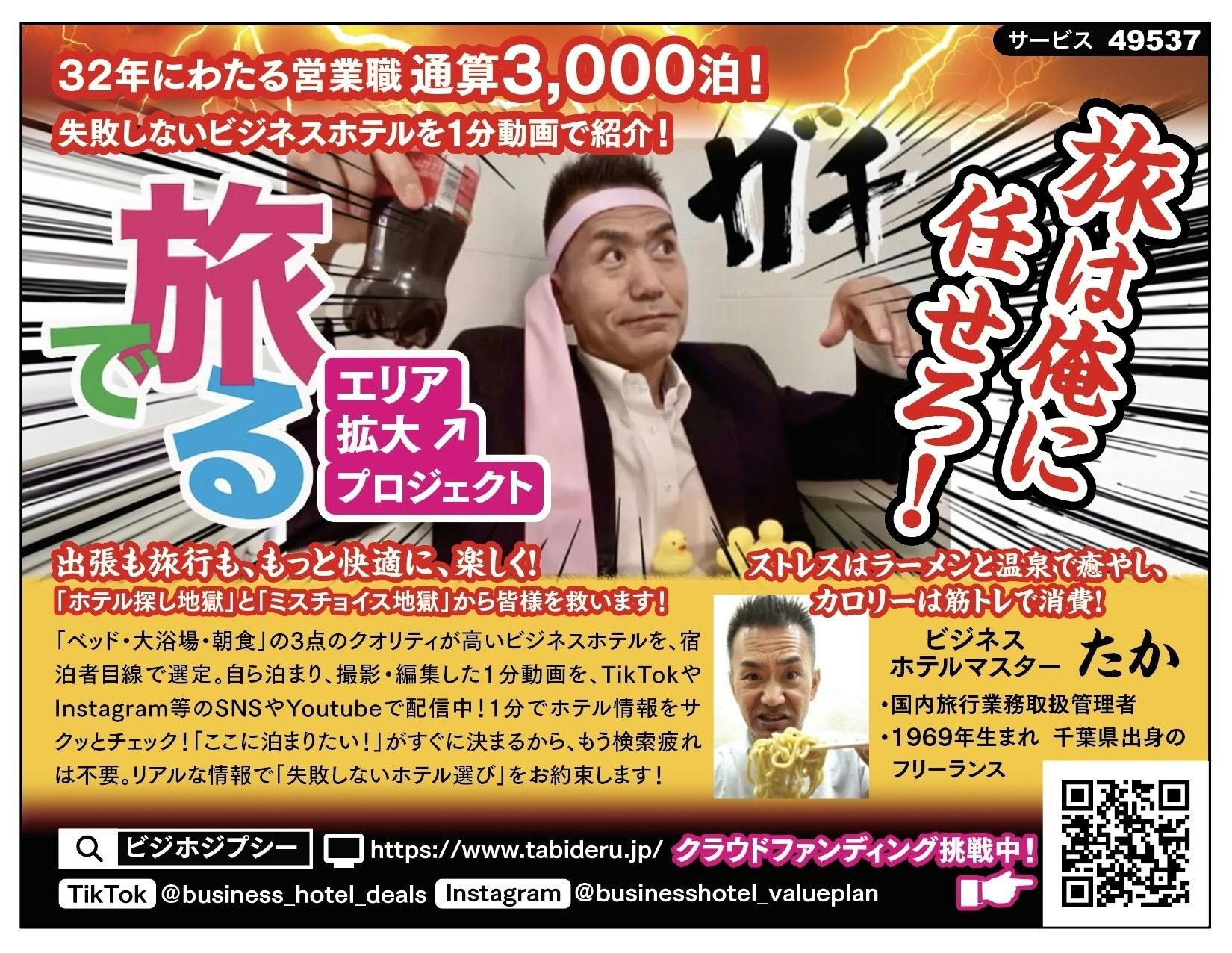 サラリーマンとして32年間、出張で3,000泊以上ビジネスホテルに宿泊してきました。その経験を活かし、ホテル選びに失敗しないための情報配信を2024年12月より本格的に開始しました。同時に会社を退職し2025年3月に起業、現在は毎月平均10ヶ所のビジネスホテルに宿泊・撮影をしながら配信しております。