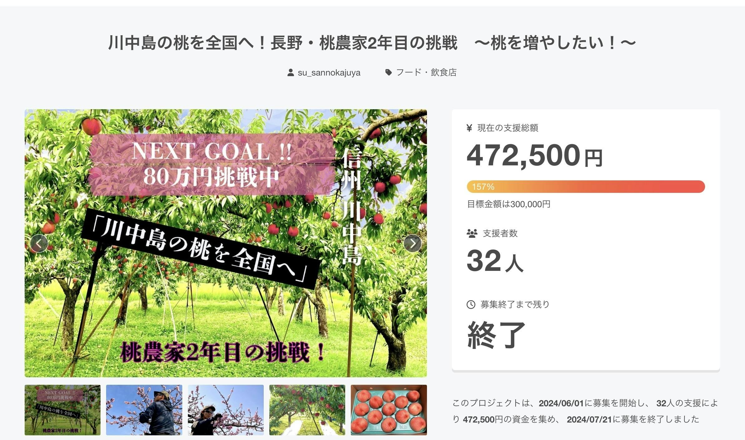 2025/08/20 19:18みなさま、こんにちは!ご支援頂きましたリターンの準備が出来ました。いよいよ「川中島白桃」の収穫を始めております。随時発送させていただきますのでお楽しみにお待ちください! もっと見る【残り2日となりました】ありがとうございます!