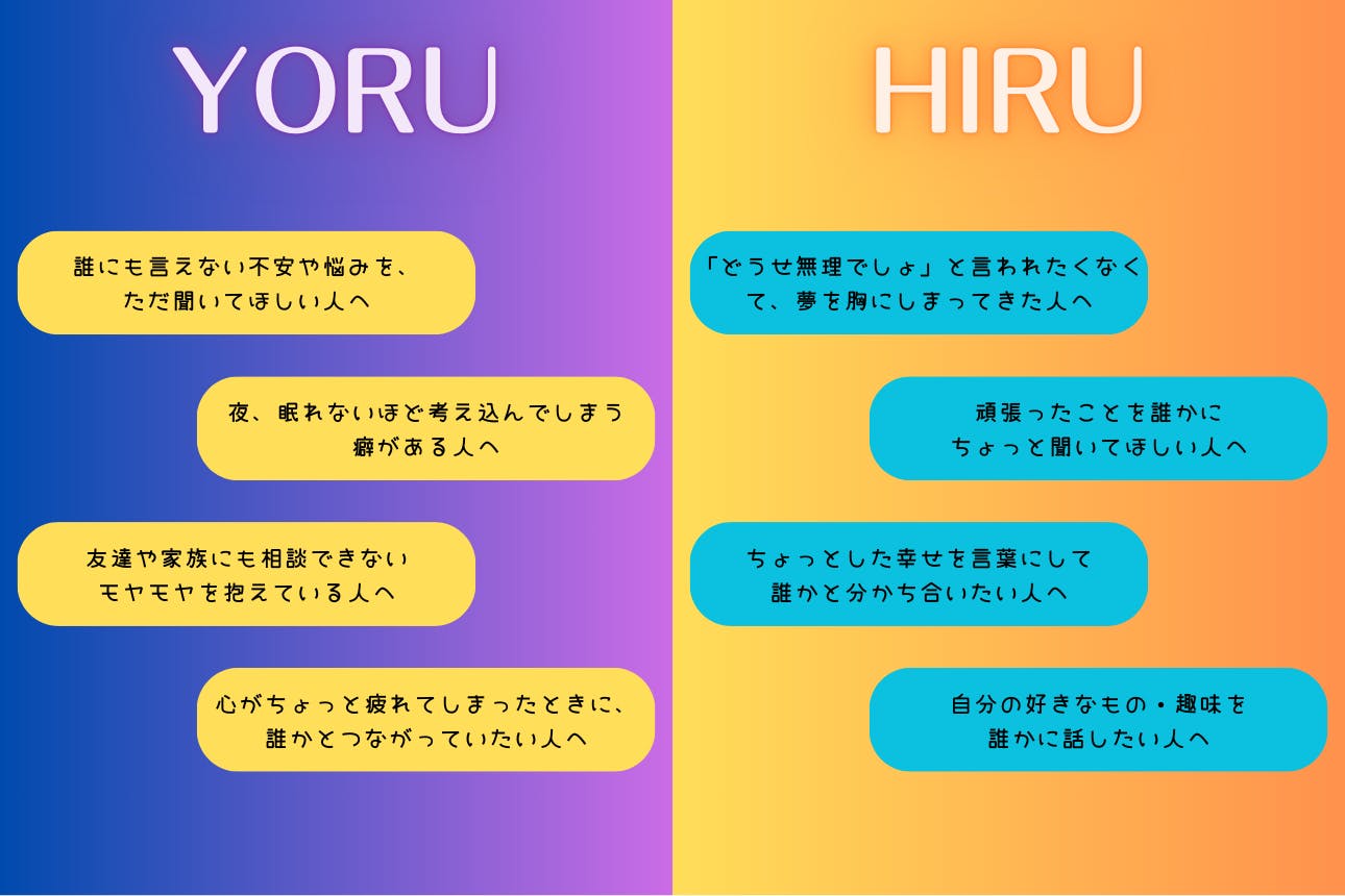 「YORU」と「HIRU」の2つのチャット