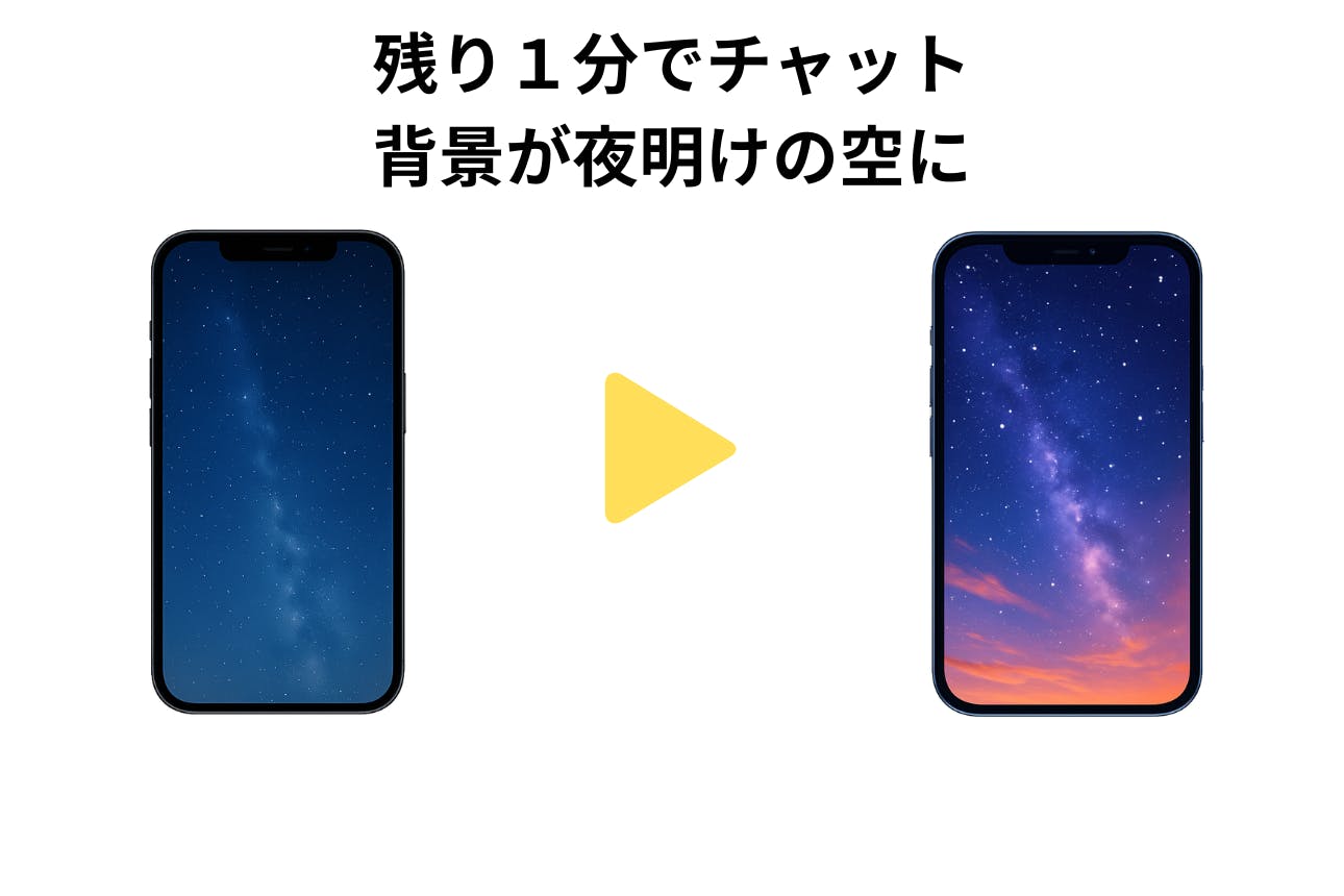 ・チャット時間が残り1分になると「YORU」ではチャットの背景が夜空から夜明けの空に変わり、「HIRU」では青空から夕焼け空に変わる