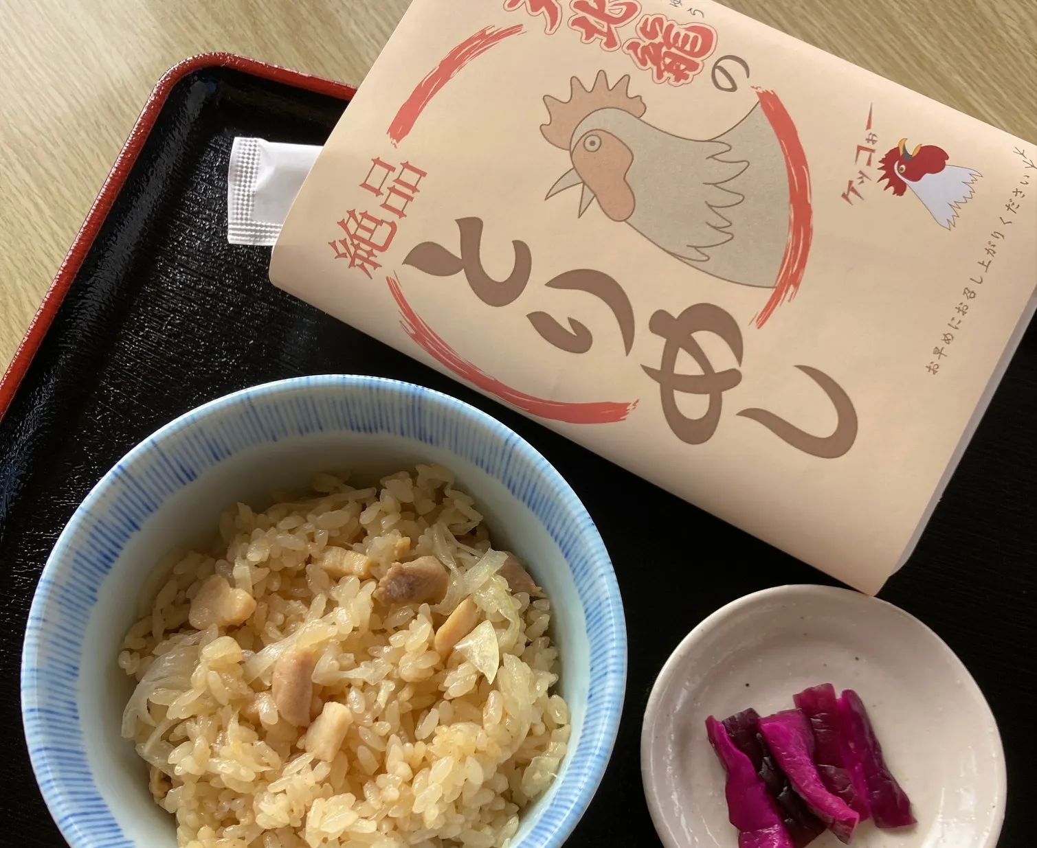 食事メニューには「とりめし」と「大[おお]とりめし」、またテイクアウトもできます。包み紙のデザインももちろん自作です。これまでこの「とりめし」メインのお弁当もイベント時に提供していますので、これから先での展開も楽しみにしています。