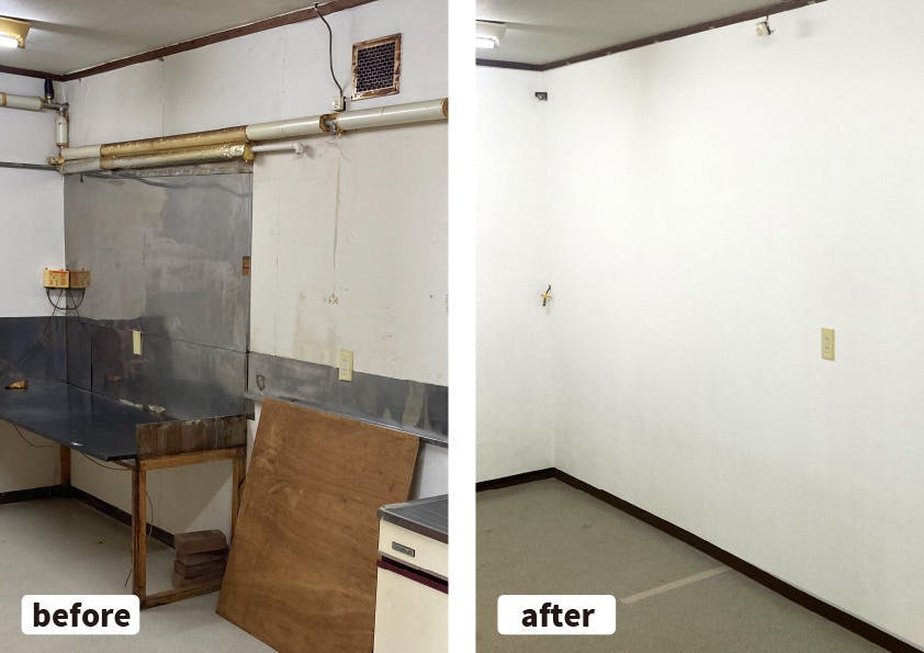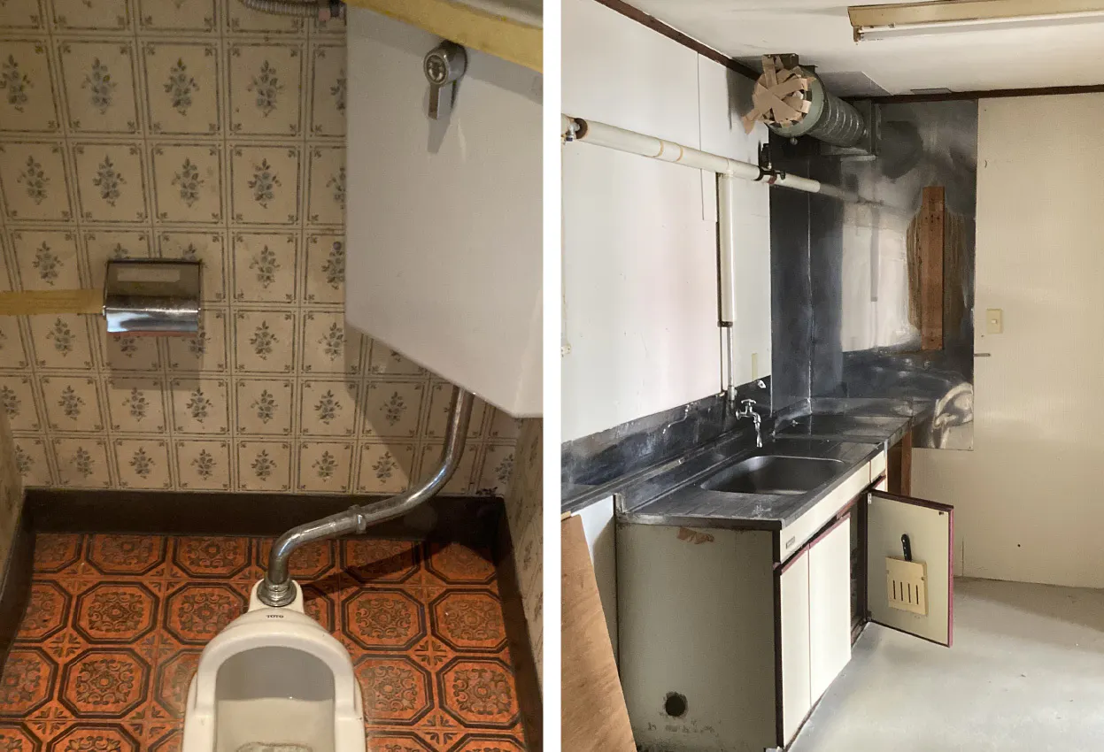 再オープンの店舗は築53年、かなりの年季が入っています。まずは自分たちで全面の掃除をして改修の必要なところをひとつひとつ吟味するところからの開始です。するとここだけは業者さんにお任せしなければという箇所が見えてきます。