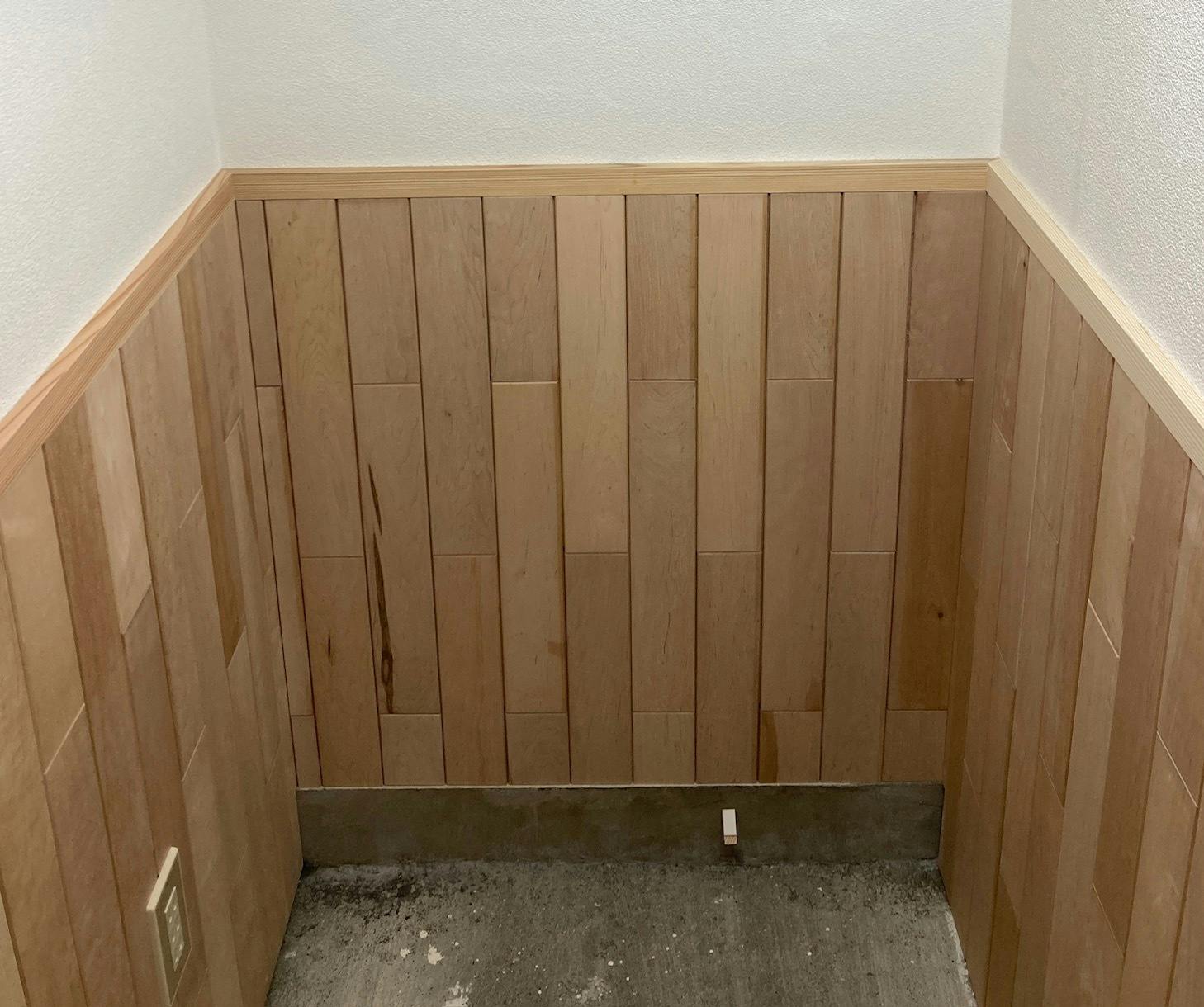 トイレの腰壁、やっとのことで造作し終えました!ここまでやるの?って感じですけど、大将の木工スキルがチリバんでますッ