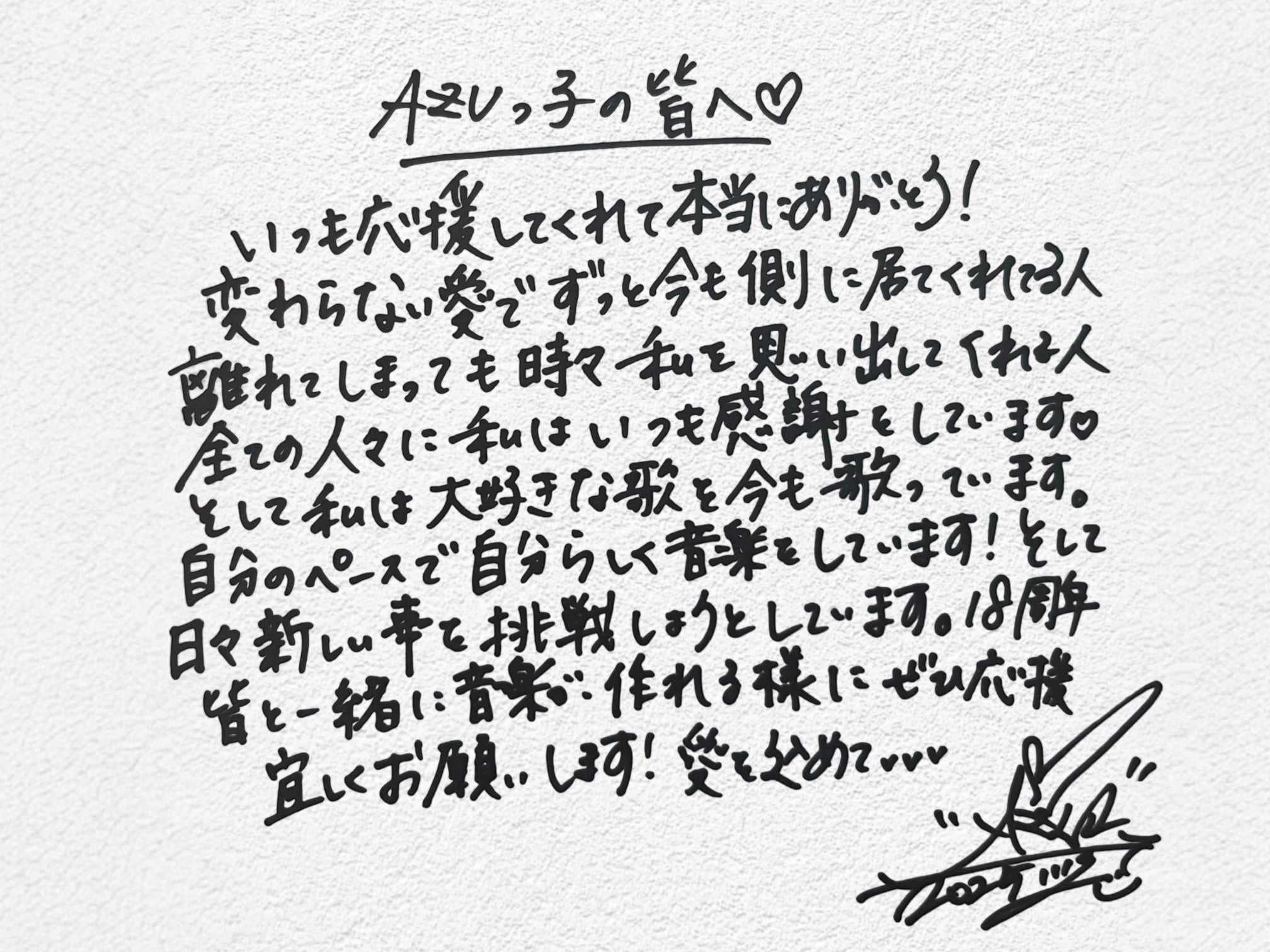 今日まで、皆さまからもらった応援の言葉、交わした笑顔、届いた沢山のメッセージその一つひとつが、私にとってかけがえのない宝物であり、音楽を続ける原動力でした。