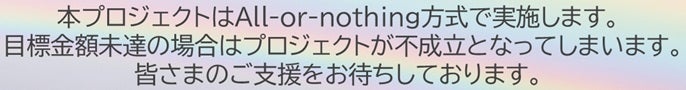 募集方式について本プロジェクトはAll-or-nothing方式で実施します。目標金額未達の場合はプロジェクトが不成立となり、ご支援がキャンセルされ全額返金されます。