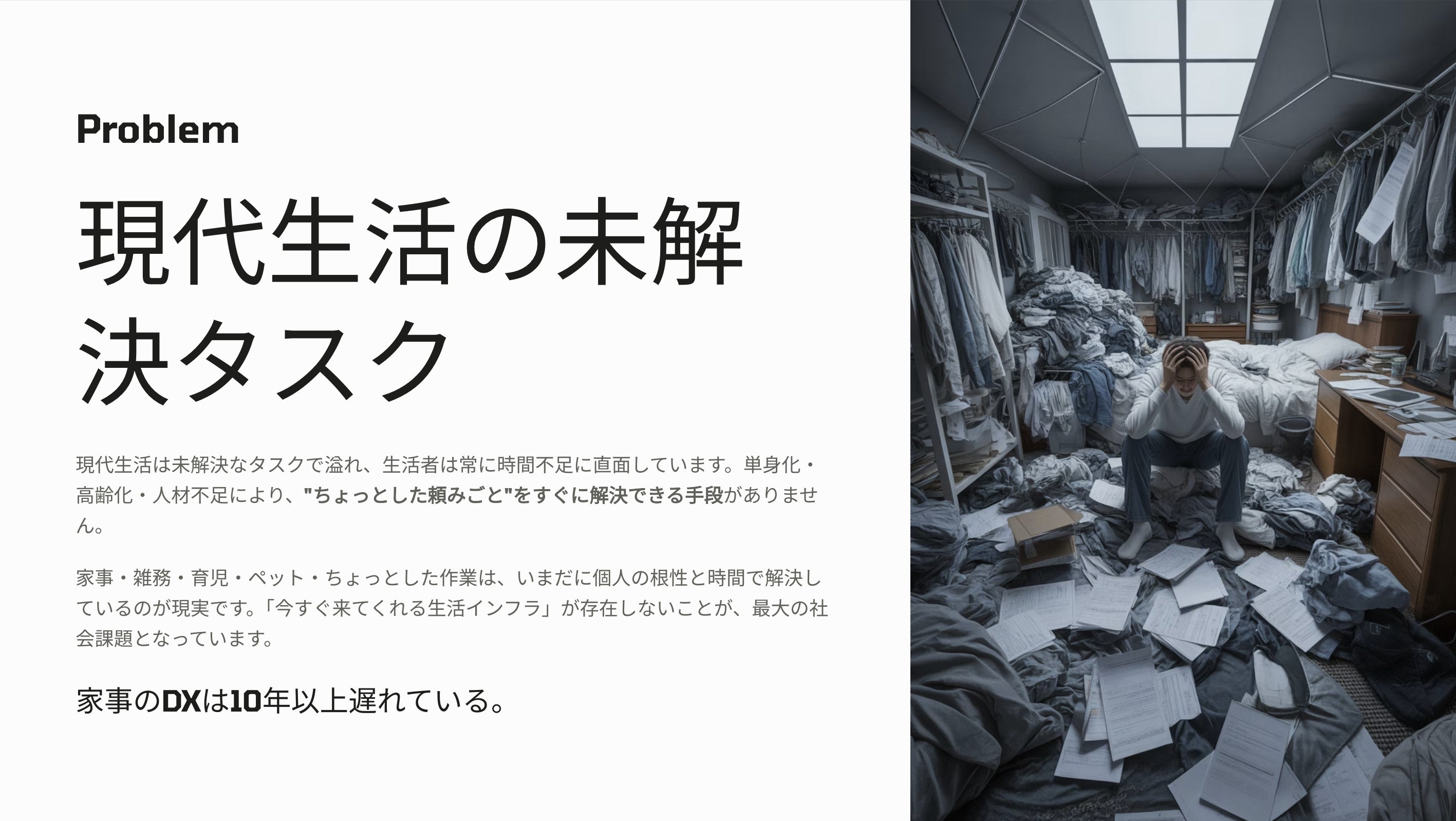 しかし現在の家事代行は、“予約必須・数日前からしか頼めない”という仕組みが一般的で、「今すぐ来てほしい」という切実なニーズには応えられていません。