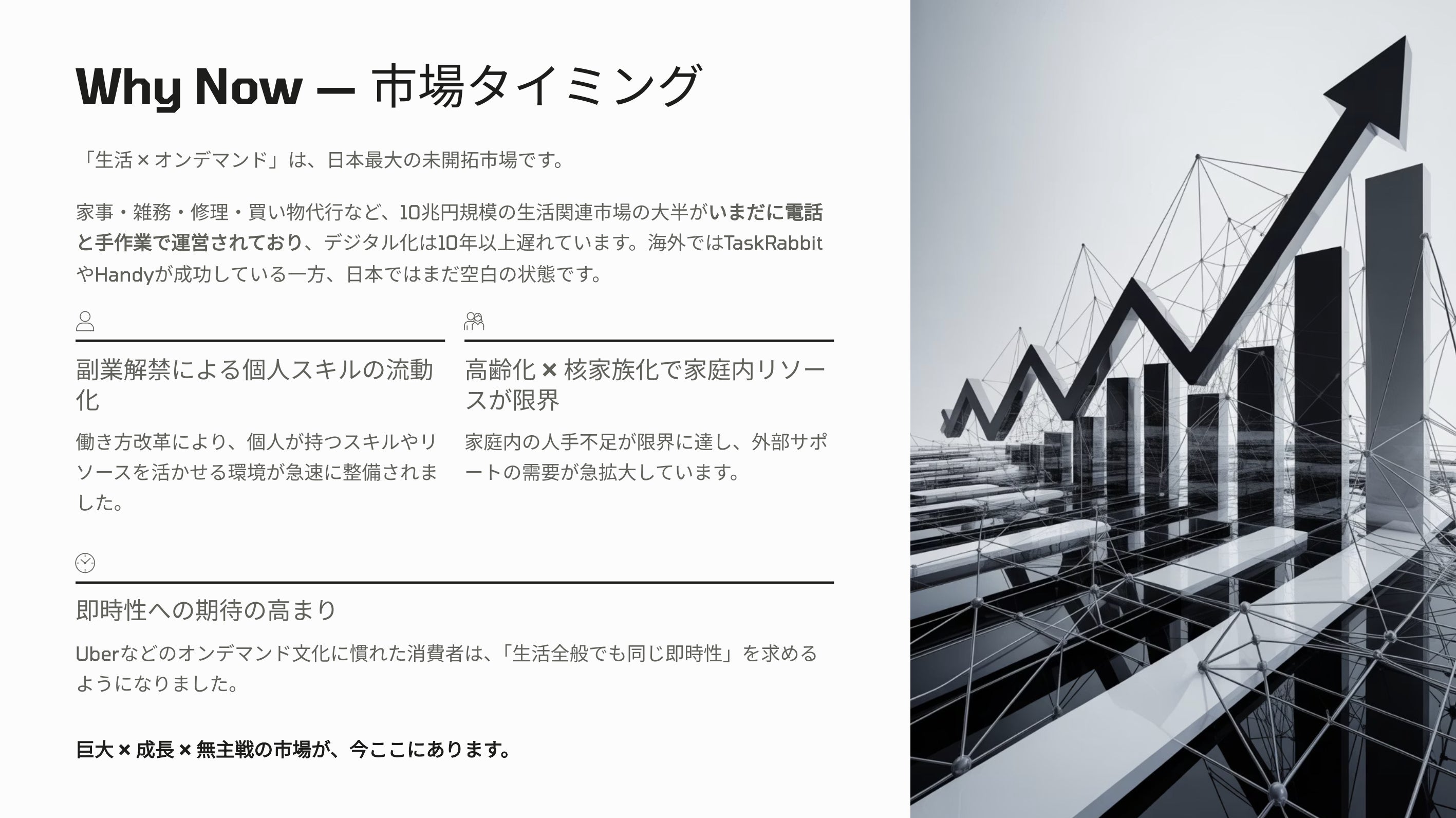 LYNQは、これまで私自身が温め続けてきた構想です。しかし“即時対応型アプリ”は開発・安全対策・ワーカー研修などの初期費用が非常に大きく、個人での負担には限界があります。