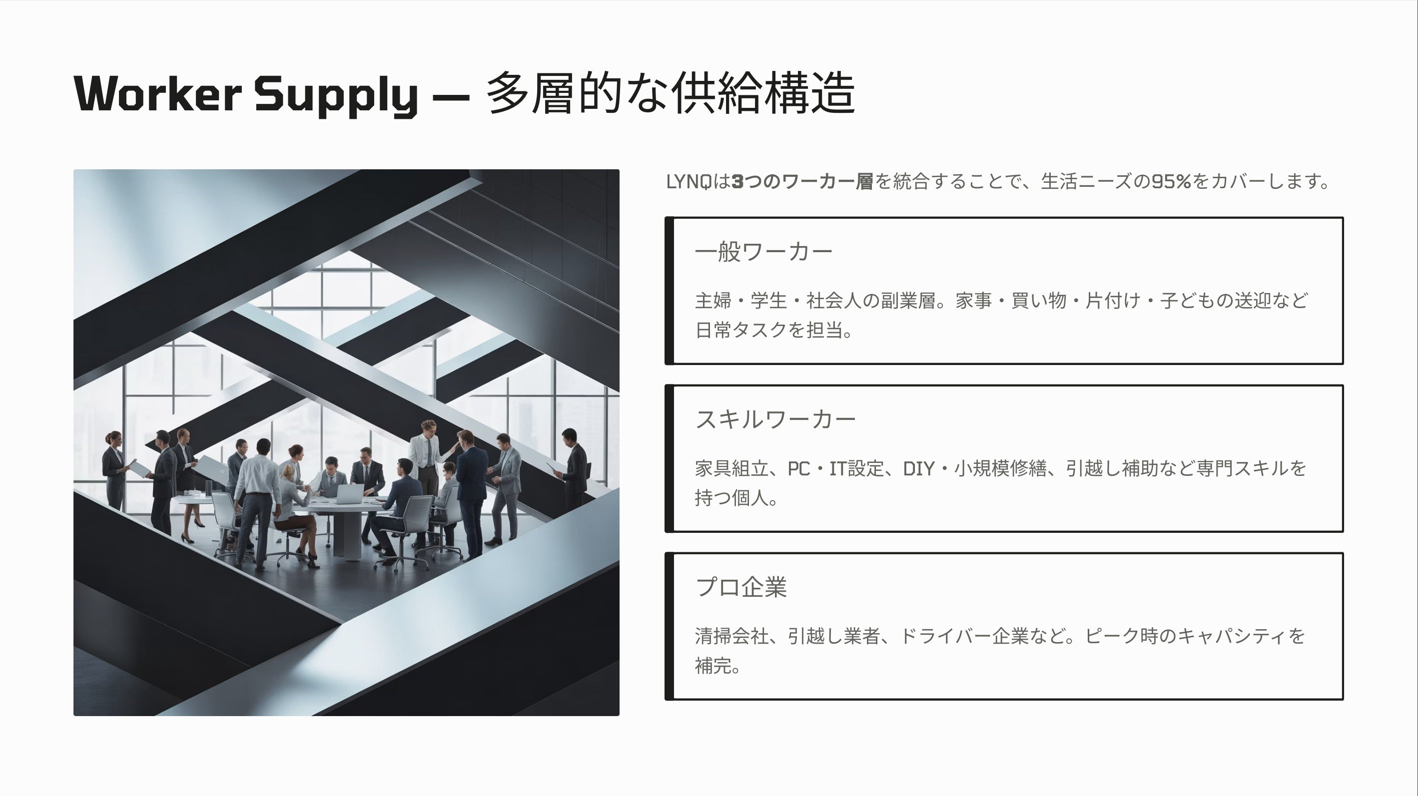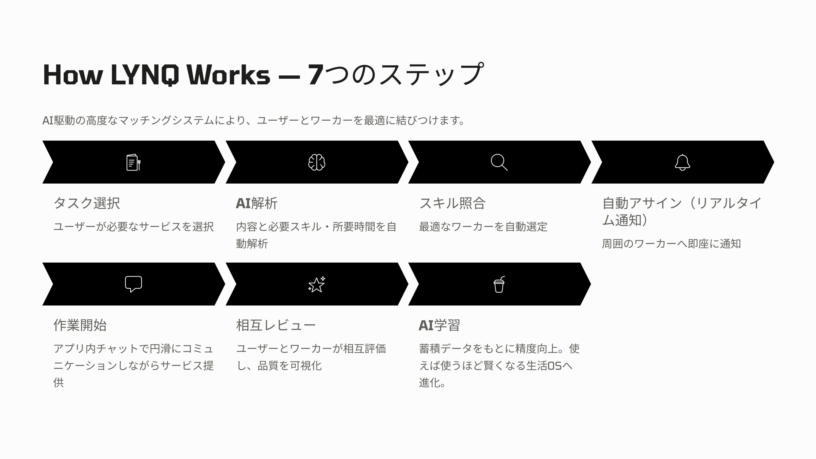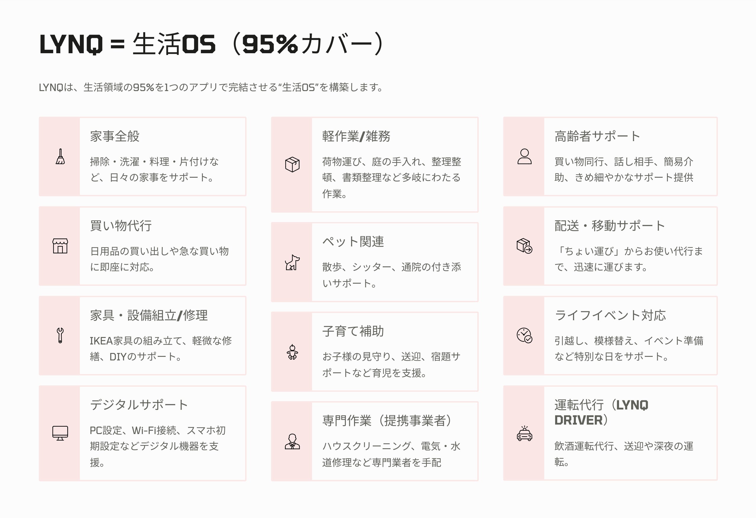スマホひとつで、家事・育児などの悩みを即解決。 “すぐ来てほしい” に応える日本初の都市型オンデマンド家事代行アプリ『LYNQ』を立ち上げます。 予約不要・最短即対応・シンプルな料金体系で、忙しい現代の暮らしを圧倒的に快適に。 東京からサービスを開始し全国展開を目指します。