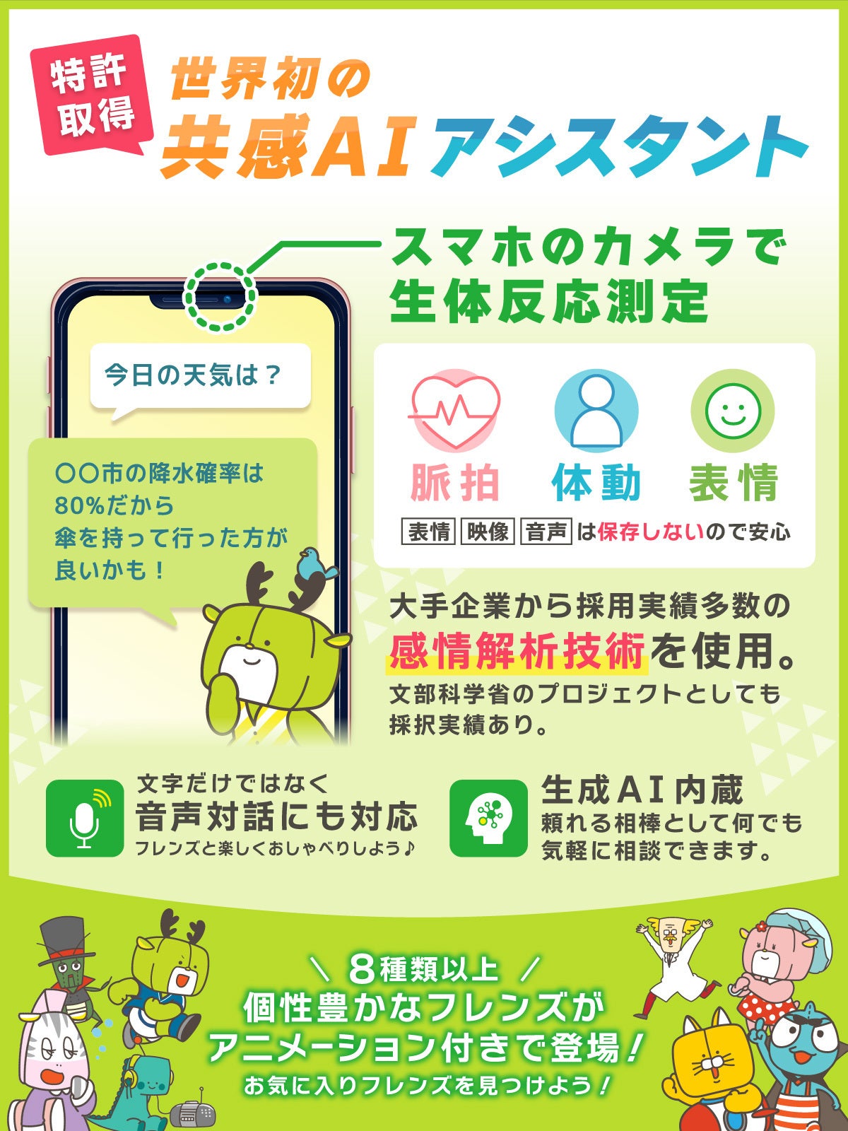 これまでの生成AIは人の感情をリアルタイムに把握し、それに基づいて反応することはできませんでした。しかし「共感AIフレンズ」アプリは、脈拍や体動といった生体反応、表情、音声、テキストなどをもとに感情をリアルタイムに解析し、あなたの今の気持ちに寄り添った言葉を返してくれます✨
