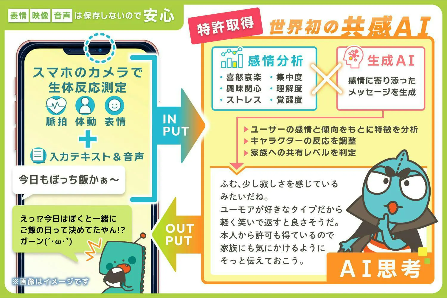 具体的には、生体反応データ(脈拍・体動など)から感情を推定するAIアルゴリズム・その感情に応じて自然な言葉・文体・話し方を生成する共感応答モデル・ユーザーごとに過去のやり取りを記憶し、応答を最適化するパーソナライズ制御・キャラクターがリアルタイムに感情に寄り添うように表情・音声・メッセージを変化させる統合制御技術