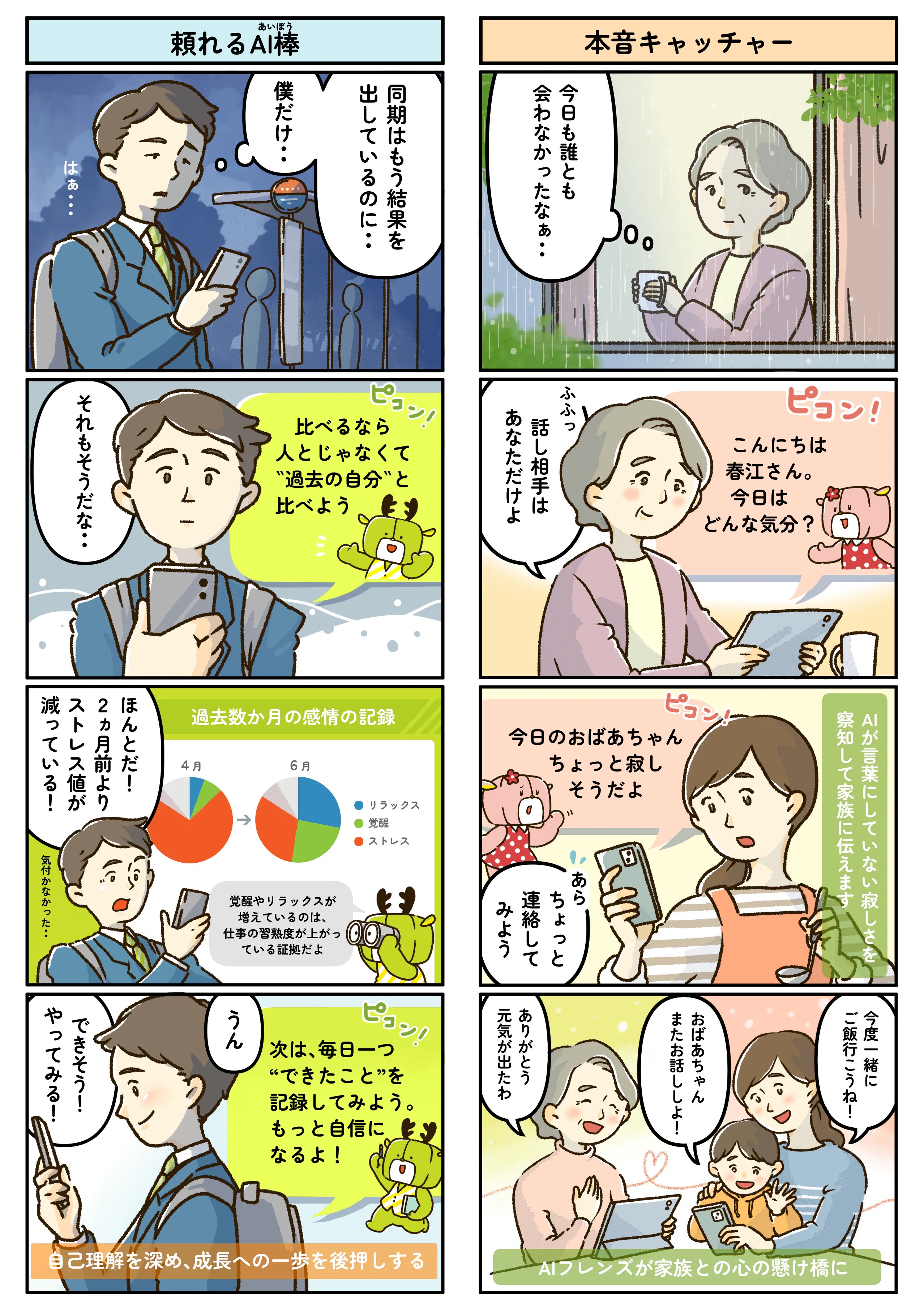 『AIフレンズ』は、AIによって「気持ちを誰かに伝える」ことを優しく支えるためのパートナーです。