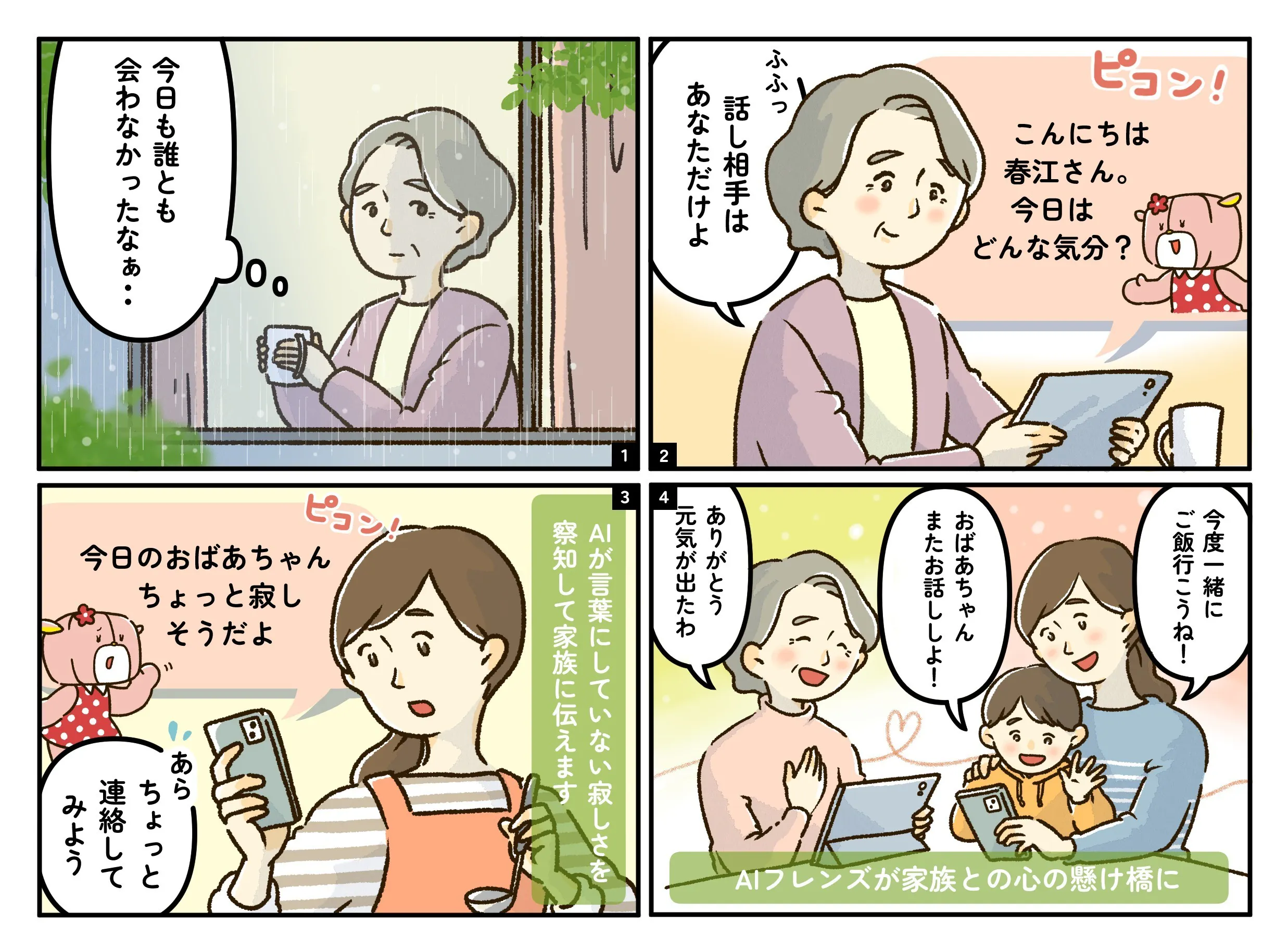 AIフレンズのファミリー機能は、家族間の「想いのすれ違い」や「気づけなかった変化」に、AIがそっと気づかせてくれる仕組みです。