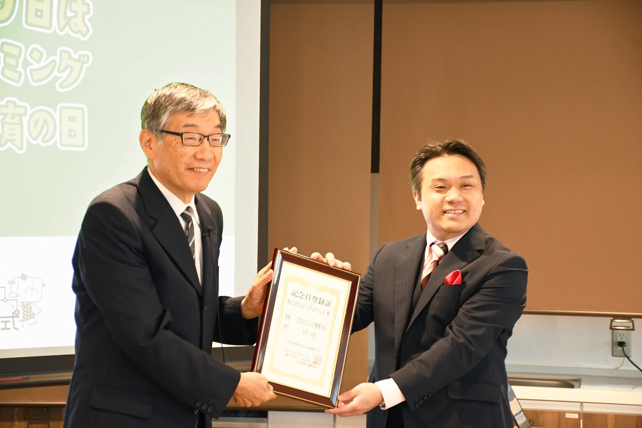 日本記念日協会の加瀬清志代表理事(左)による記念日登録証の授与式