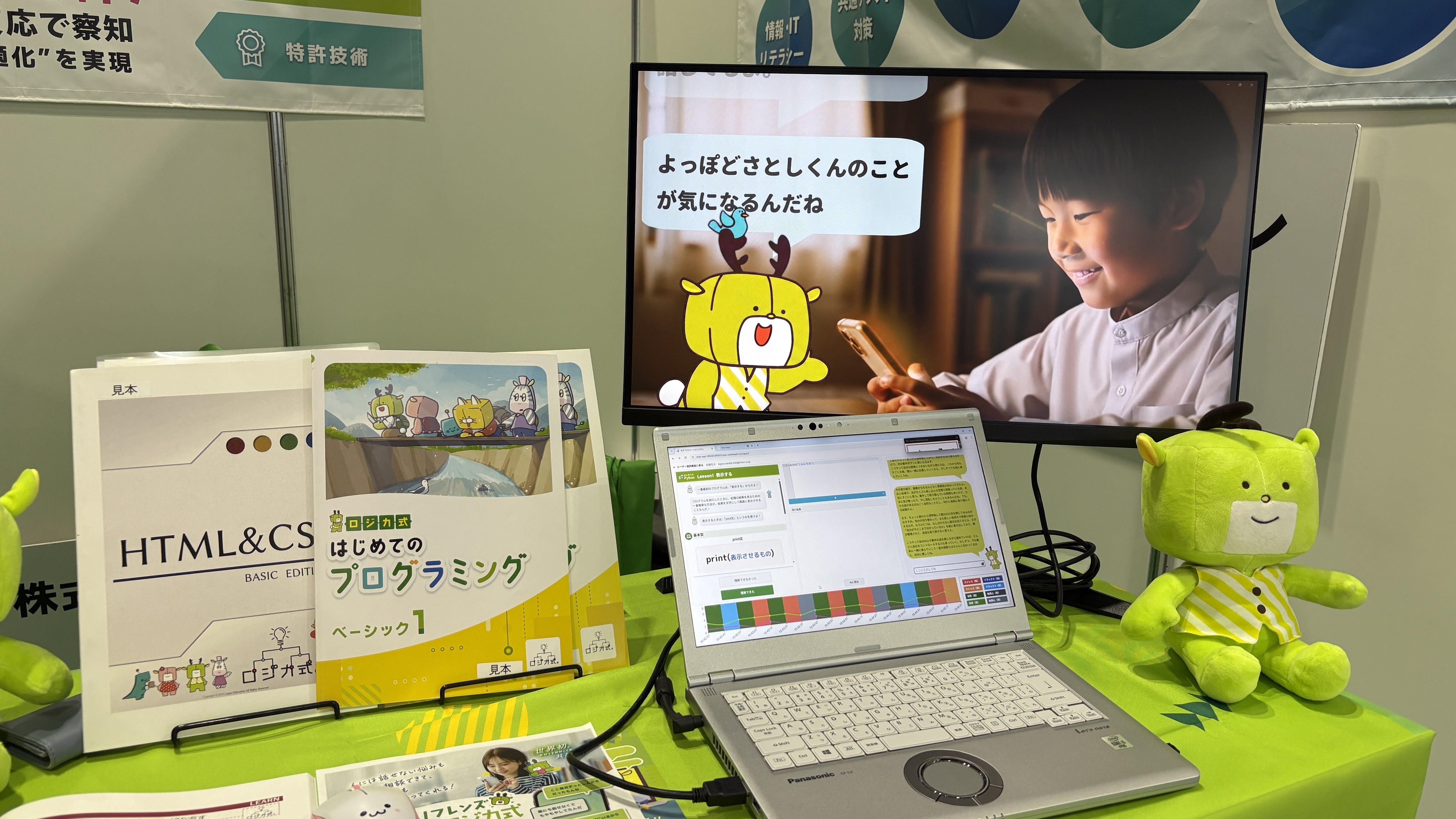 ブースでは、ロジカ式のプログラミング教材の展示や、AIアプリの紹介を行いました。パソコンを使った教育版AIアシスタントのデモ機を体験されたからは「すごい!」の声が!生体反応から感情を分析し、生成AIで気持ちに寄り添った声をかけてくれる、AI技術が教育現場にもたらす可能性を実感していただけました。