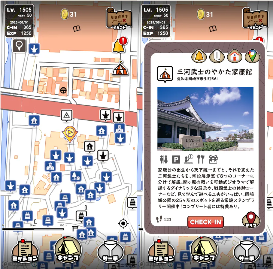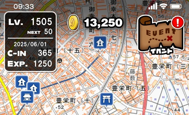 現在マップ左上にレベルを表記しているボタンを「ダッシュボード」機能として、現在のレベルのほか、その日のチェックイン数(+Exp.)が一目でわかるようにします。これにより、日々の「達成度」が可視化され、その日のチェックイン数を仲間同士で競い合うことができるようになります。