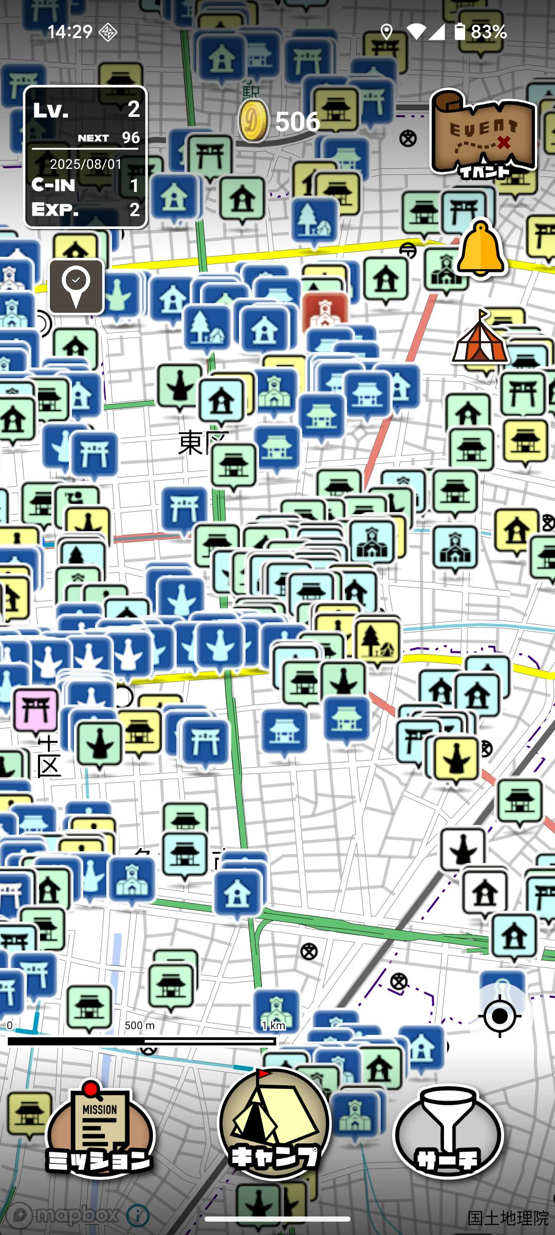 現在マップ左上にレベルを表記しているボタンを「ダッシュボード」機能として、現在のレベルのほか、その日のチェックイン数(+Exp.)が一目でわかるようにします。これにより、日々の「達成度」が可視化され、その日のチェックイン数を仲間同士で競い合うことができるようになります。
