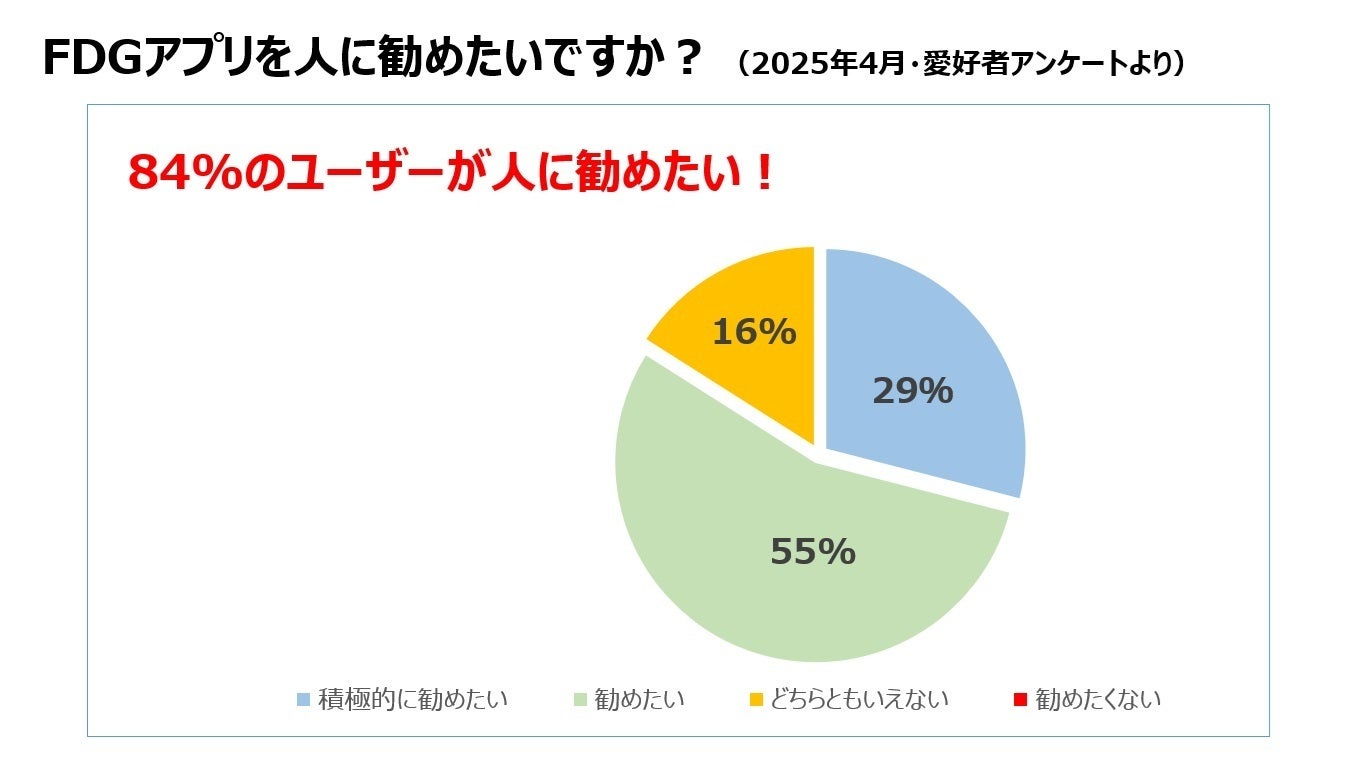 ハマる人はハマるFDGですが、まだまだこのアプリ、世間一般に知られておりません。ユーザー数が増えれば増えるほど、企業とのコラボも増え、より安定的・継続的なアプリ運営が可能となります。FDGをもっと世の中に広めたい!と思ってくださっている「FDGファン」の皆様には、ぜひ身近な周りの方に、FDGの魅力をどんどんとご紹介いただければ幸いです。