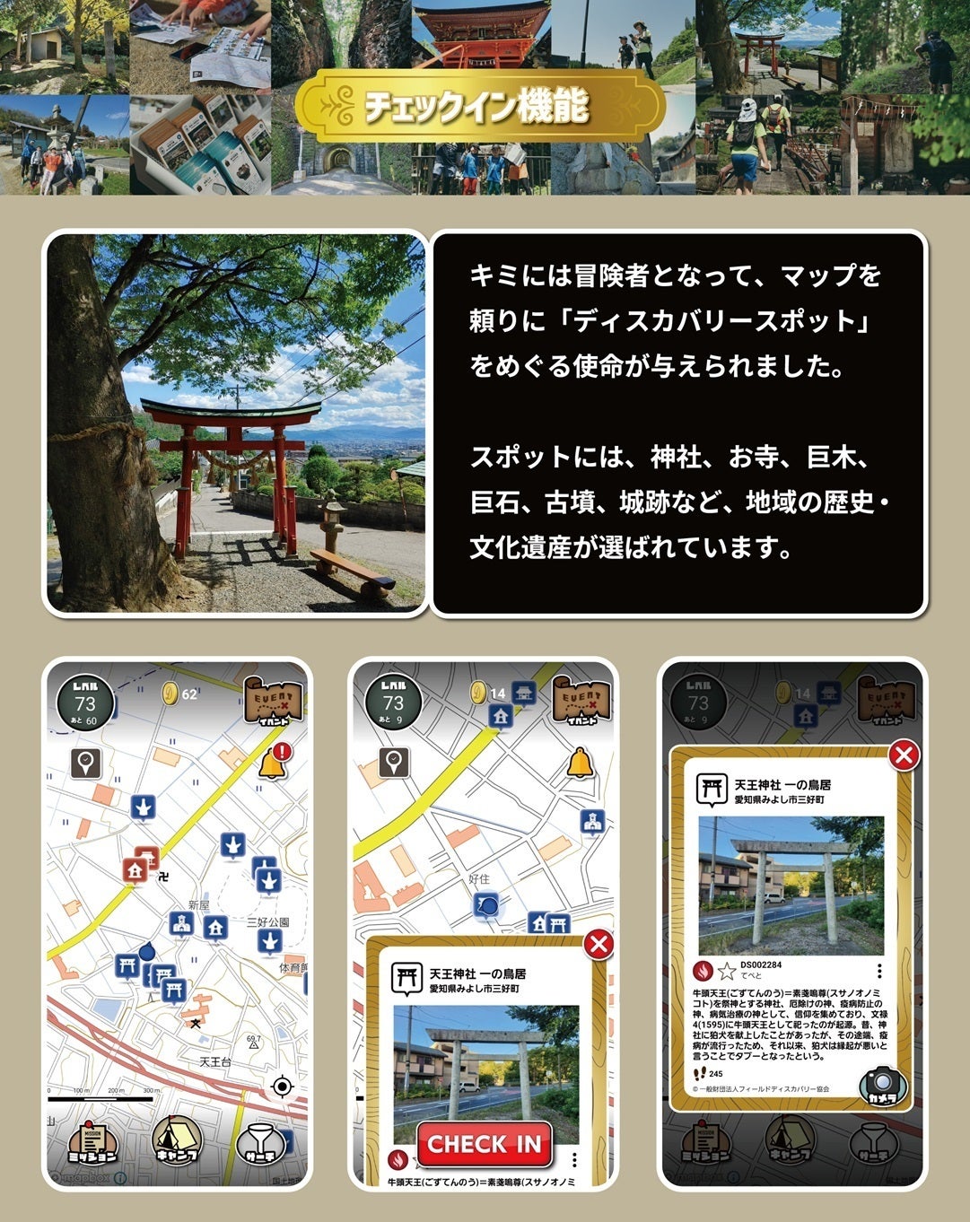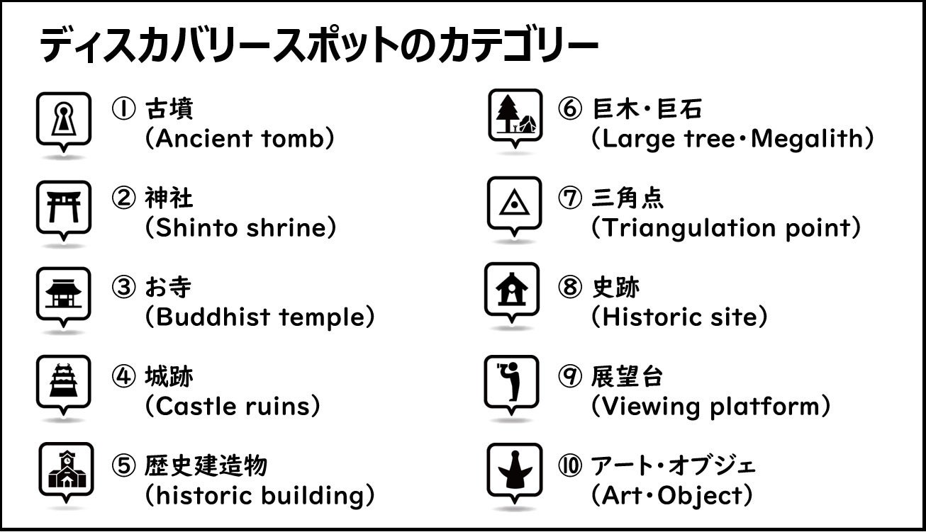 具体的には…地域に埋もれた消えゆく日本の歴史・文化遺産に光を当て、古墳・神社仏閣・城跡・歴史建造物・石仏・巨木・巨石・三角点などを「ディスカバリースポット」として再定義し、それらスポット巡りをコンテンツ(ゲーム化・スポーツ化)したものです。
