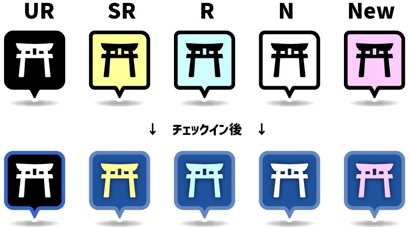 「4段階のレア度:UR(ウルトラレア)・SR(スーパーレア)・R(レア)・N(ノーマル)」を設定します。更に、「レア度の高いスポットへのチェックイン時はより多くの経験値(Exp.)を得る」ことができ、「レベルアップやランキングのポイントにも反映される」ようにします。