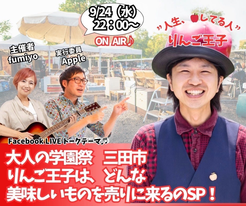 2025/09/24 12:46いつも温かいご支援を本当にありがとうございます!いよいよ11月に三田で開催される「大人の学園祭」に向けて、特別なコラボ企画ライブ配信のお知らせです!今回は、主催者の fumiyoさん、実行委員の アップル吉田さん、そして りんご王子 と一緒に、LIVE配信を通して学園祭を盛り上げます!りんごの魅力と学園祭の熱気を、オンラインでも楽しんでいただける特別な企画です。○ライブ配信予定 9月24日(火)22時〜 fumiyoさん × りんご王子 Facebookライブ 9月25日(水)22時〜 アップル吉田さん × りんご王子 Facebookライブ りんご王子のFacebookはこちら▽https://www.facebook.com/keiji.murakawa.5/?locale=ja_JP もっと見る