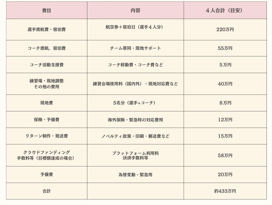 • 大会参加費・イタリアまでの遠征費・現地での費用・練習にかかる費用・コーチの遠征費・リターン仕入れ費等