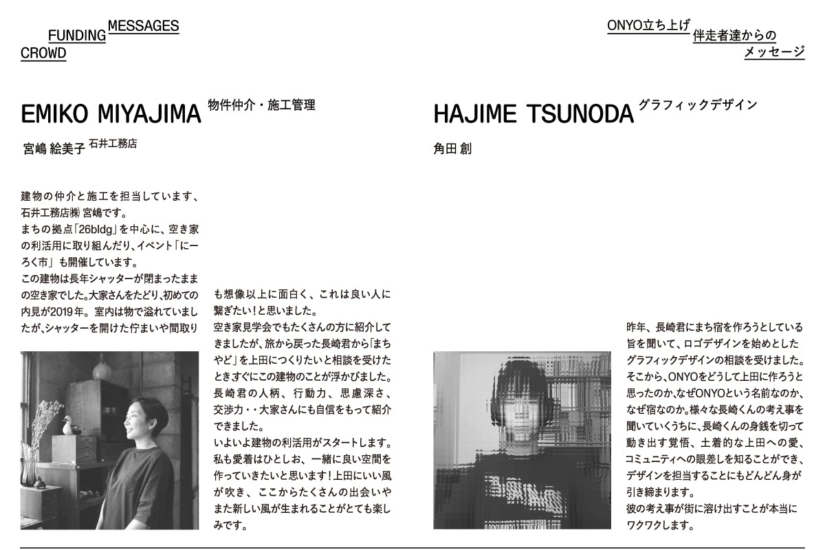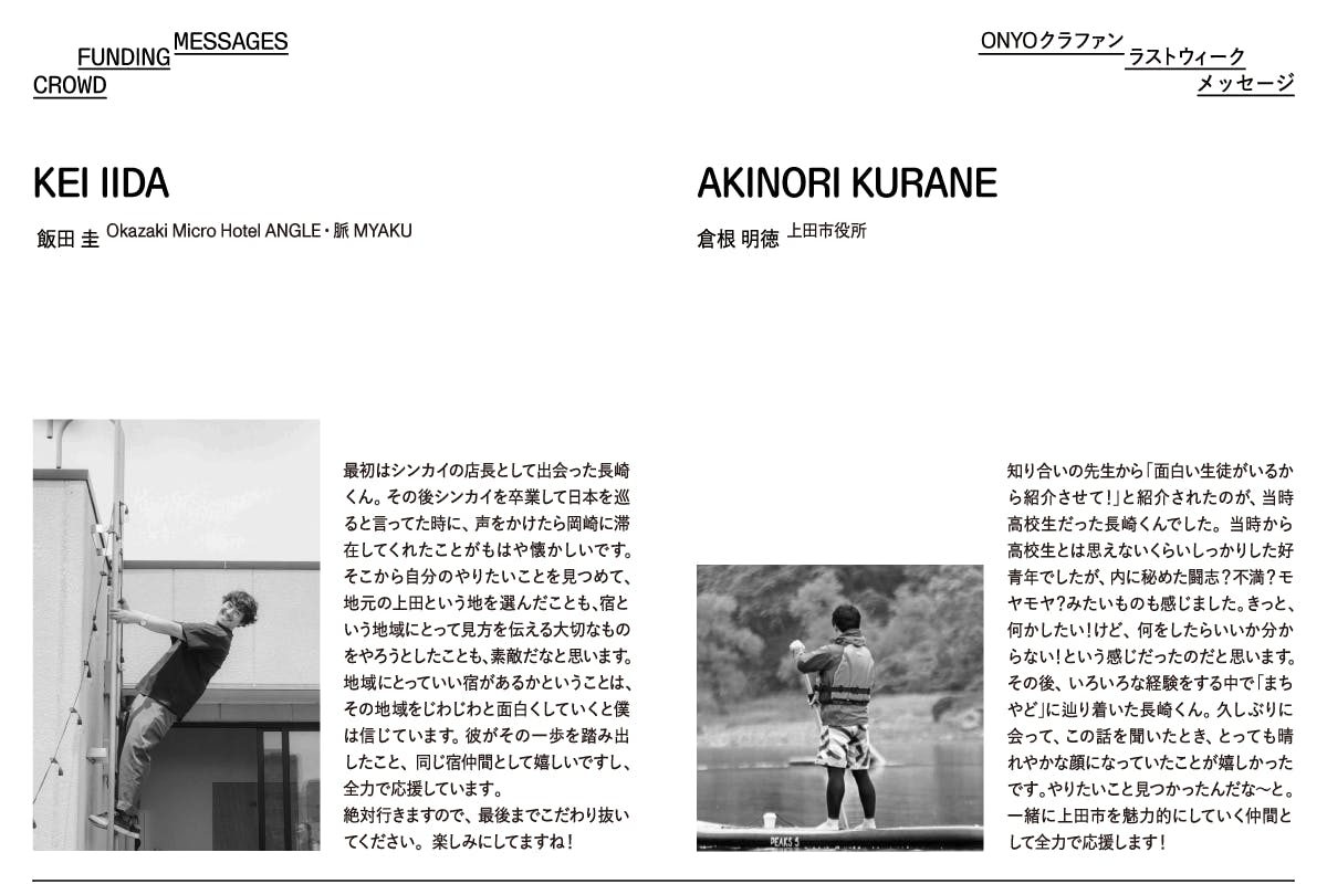 2025/07/20 16:0640日間に及ぶクラウドファンディングも本日が最終日です。連日、絶えぬご支援・ご声援ほんとうにありがとうございます。言い表せぬほどの感謝の気持ちを胸に、ここからまずは開業に向けて、また歩を進めたいと思います。最終日に、2名の方からの応援メッセージをご紹介させていただきます。残り数時間、最後まで応援よろしくお願いいたします。=======================【上田市に宿と飲食「ONYO Hotel and Lounge」を開業します】目標金額:350万円支援期間:7月20日23:59までクラウドファンディングページはこちらからhttps://camp-fire.jp/projects/853517/view======================= もっと見る