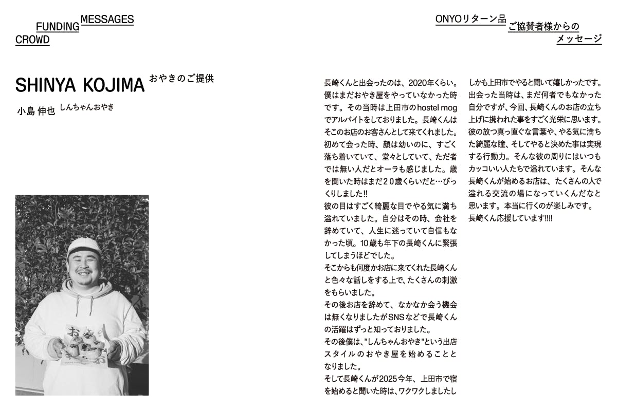 2025/07/26 09:25少し時間が空いてしまいましたが、改めて40日間に及ぶクラウドファンディング、たくさんのご支援並びにご声援、本当に、本当にありがとうございました。ご支援者数は最終的に321人にまでのぼり、無事に目標金額を上回ることができました。ただただ感謝の限りです。開業に向けた準備と並行して、返礼品の発送・送付も行なっていきます。もうしばし、お待ちください。返礼品にまつわるご不明点などがございましたら、お気軽にCAMPFIREのメッセージなどでご連絡いただければと思います。いよいよ週明け28日からは、本工場が始まります。クラウドファンディングを終えて、既にONYOという場所が自分だけでない意識は、より一層強くなりました。だからこそ、より一層気合も入れて準備に励みたい所存です。定期的にこちらの活動報告でも準備の様子をご報告できればと思いますので、よろしければ温かい目で見守っていただけると幸いです。改めて、多大なるご支援とご声援、本当にありがとうございました! もっと見る