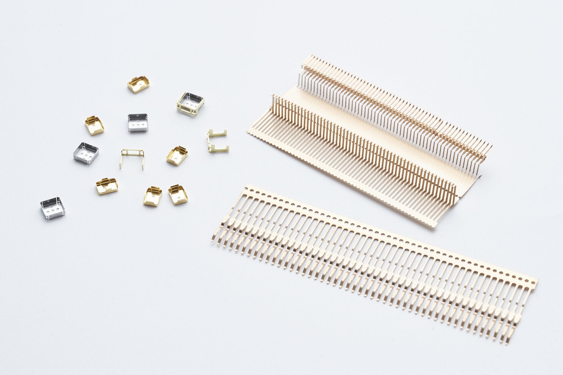 ▲当社の金型を使用し生産したコネクター端子と小型スイッチ部品