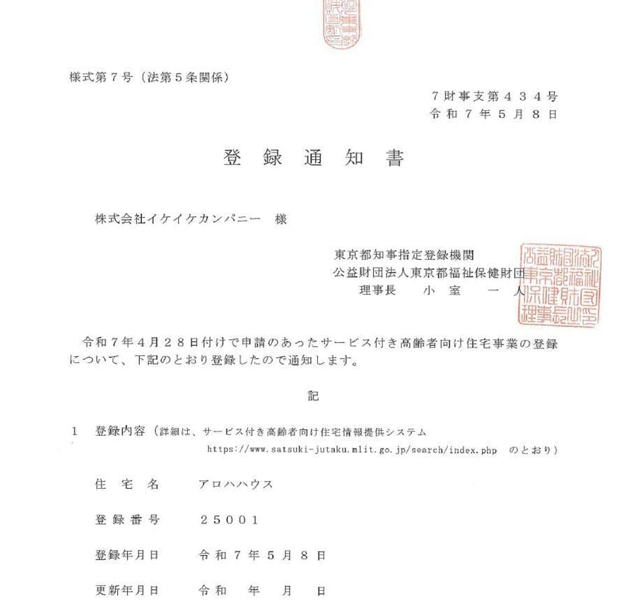 📅 2025年5月8日ついに、東京都より「サービス付き高齢者向け住宅」の登録通知書が交付され、正式な事業として認められました。ここまでの道のりは、制度の壁と現場の声のはざまで試行錯誤の連続でしたが、仲間や専門家、関係機関の皆様の支えで、ようやくここまで来ました。