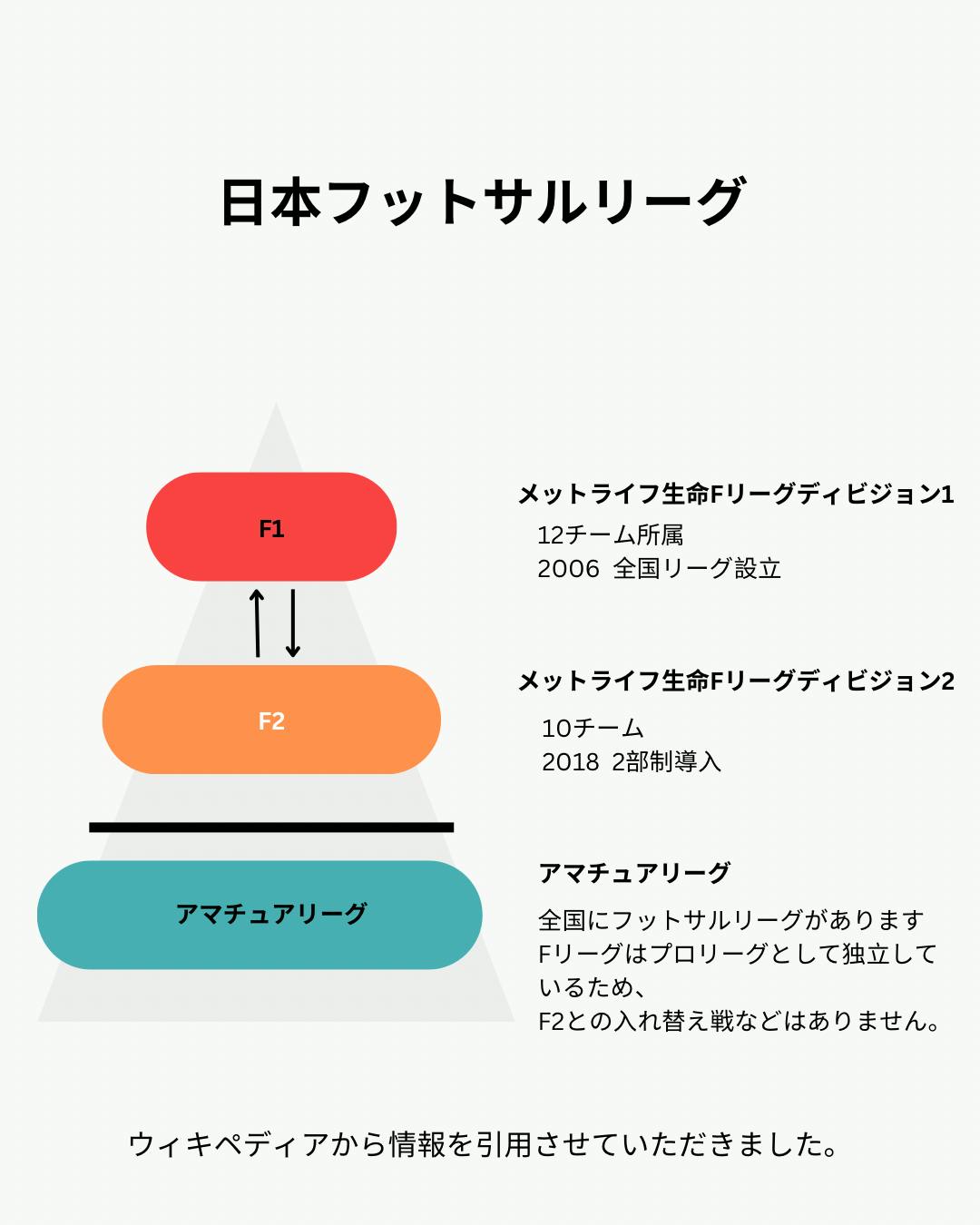 現在、日本には「Fリーグ」というプロリーグがあり、ディビジョン1と2に分かれて全国のクラブが熱戦を繰り広げています。