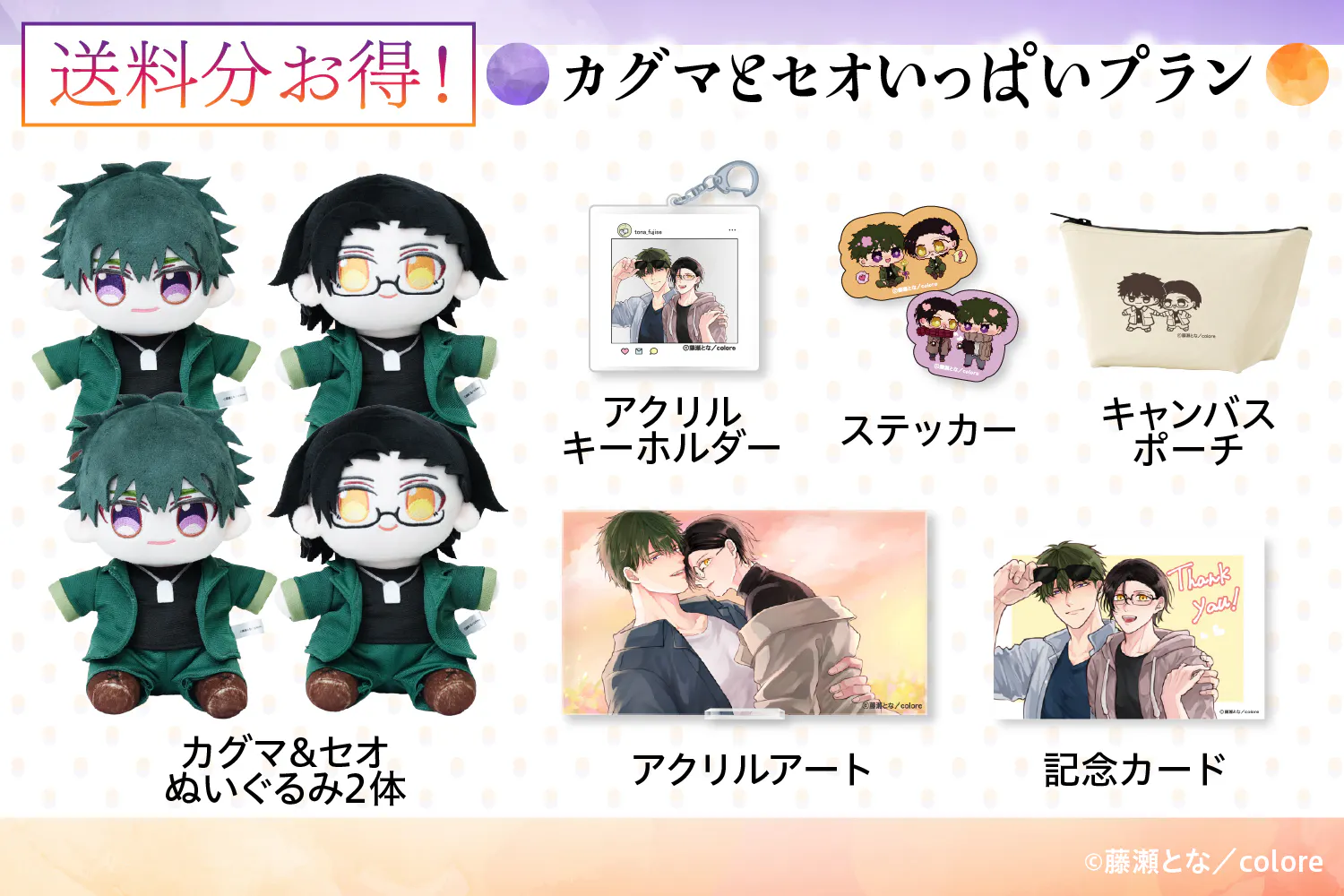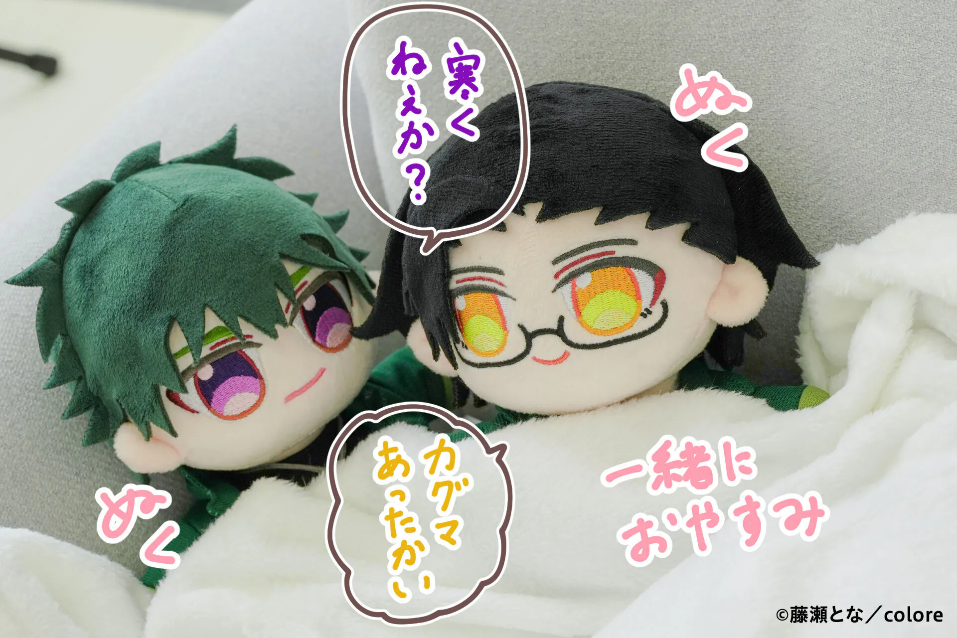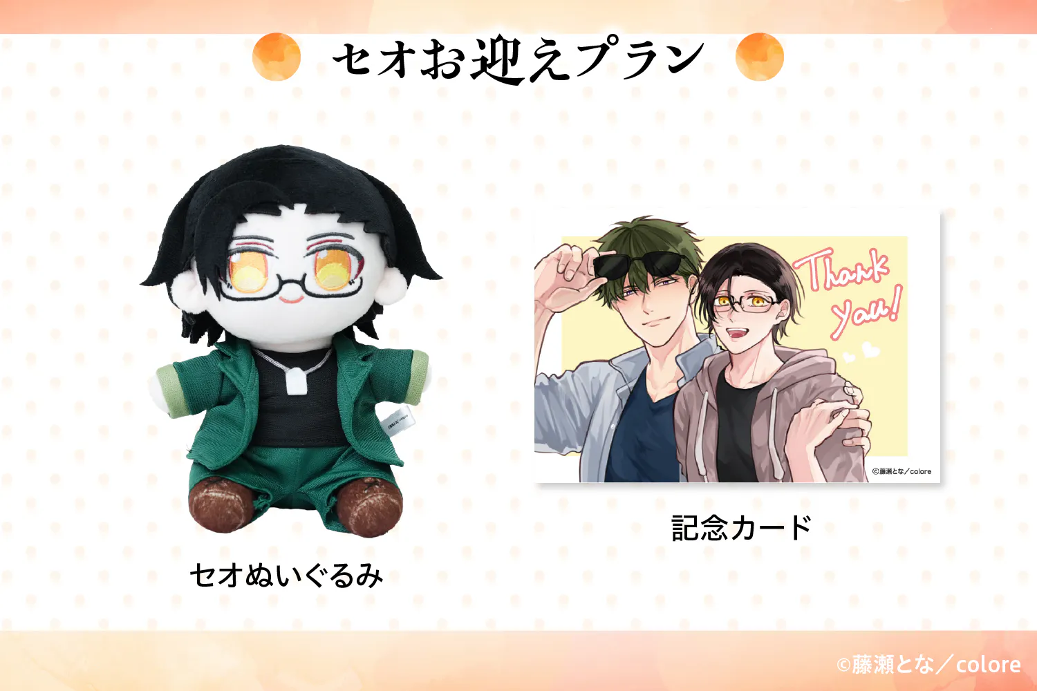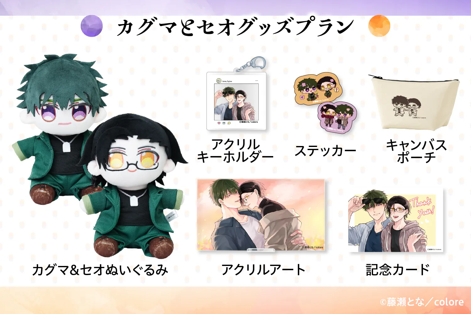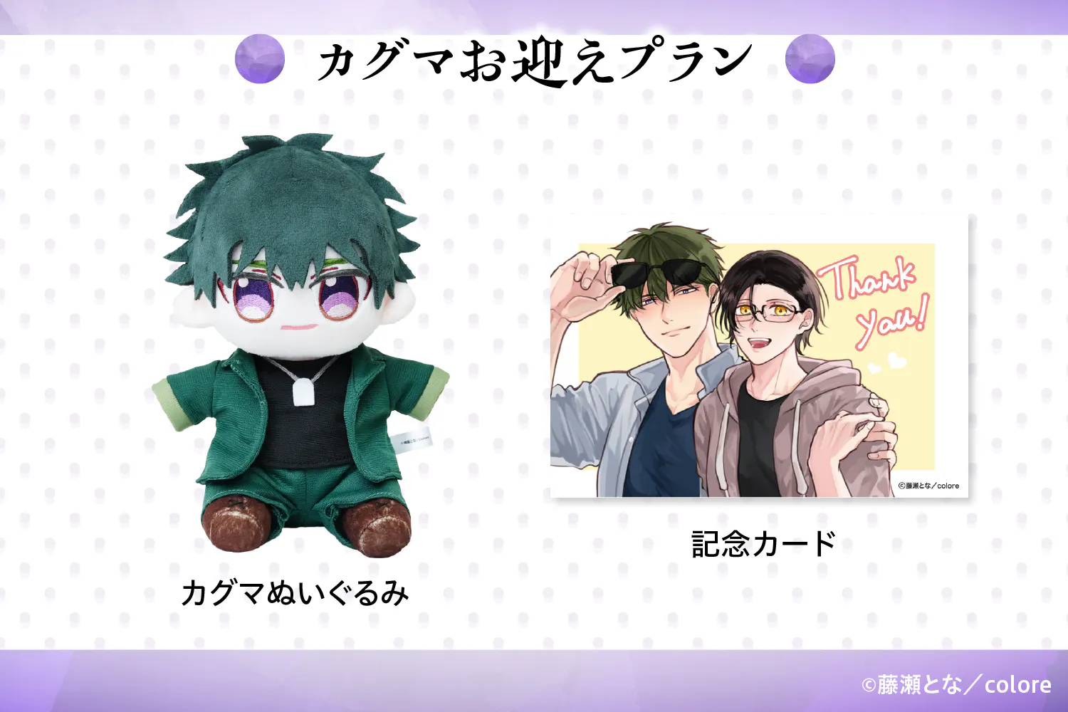 漫画家藤瀬となが描くBL漫画『落ちる色は、琥珀色』から「カグマとセオ」がぬいぐるみ化に挑戦します!